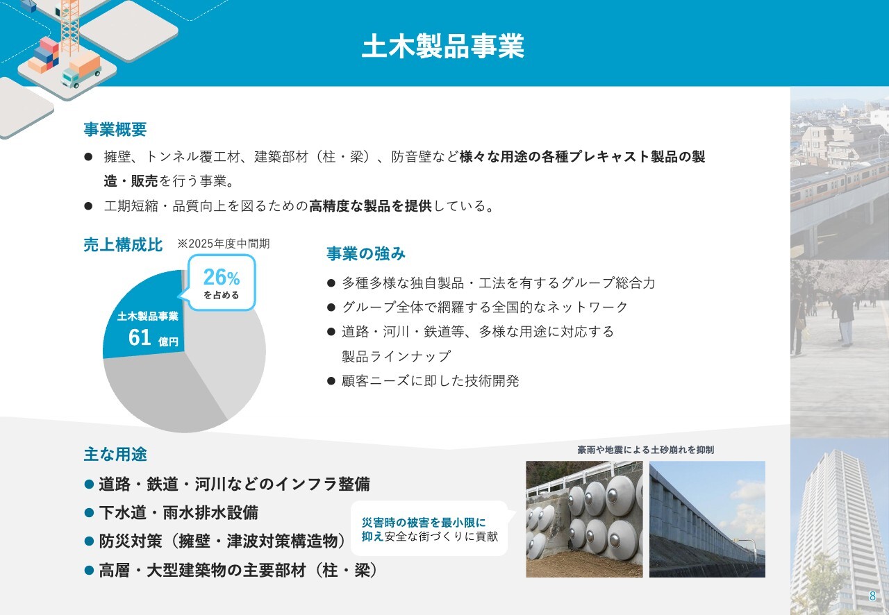 土木製品事業についてです。事業の概要としては、擁壁やトンネル覆工材、建築部材(柱・梁)、防音壁など、さまざまな用途に対応した各種プレキャスト製品の製造・販売を行っています。