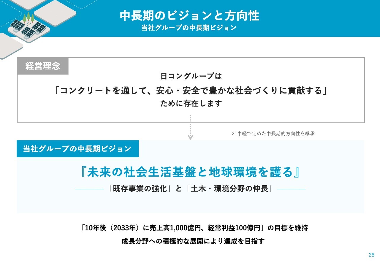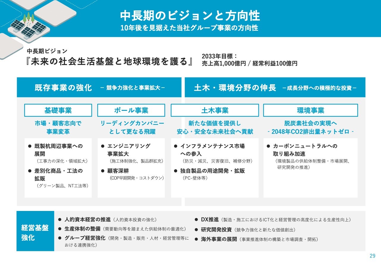 それらを受けた中長期ビジョンと方向性です。当社グループは経営理念に基づき、中長期ビジョンとして「『未来の社会生活基盤と地球環境を護る』―『既存事業の強化』と『土木・環境分野の伸長』―」を掲げました。そして「10年後(2033年)に売上高1,000億円、経常利益100億円」を達成することを目標としています。