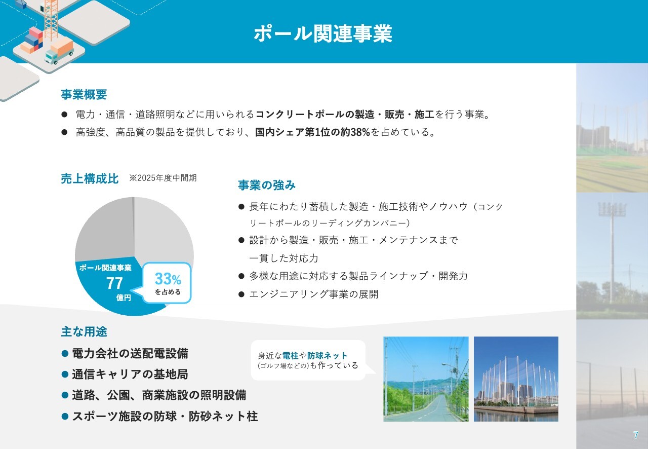 ポール関連事業についてです。事業の概要としては、電力・通信・道路照明などに使用されるコンクリートポールの製造・販売および施工を行う事業です。国内シェア第1位を占めています。