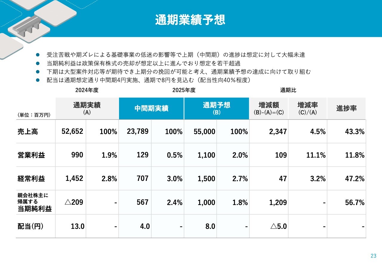 2025年度の通期業績予想です。中間期においては受注の苦戦や期ズレによる基礎事業の低迷が影響し、進捗は想定を大幅に下回る結果となりました。ただし当期純利益に関しては、政策保有株式の売却が予想以上に進んでいるため、若干の超過となっています。配当は通期の期初想定どおり、中間期で4円を実施する予定です。