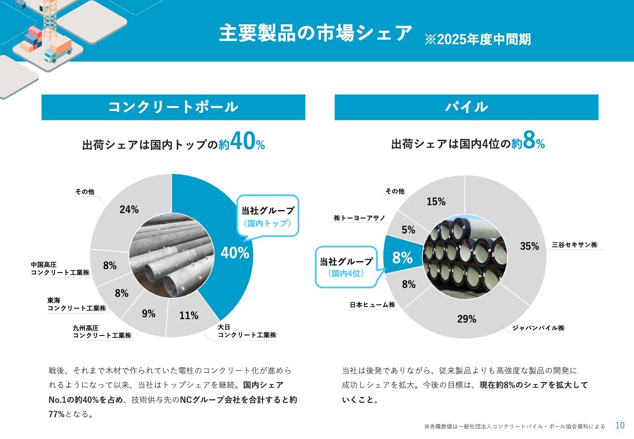 パイルに関しては、出荷シェアが国内4位の約8パーセントとなっています。現在、この約8パーセントのシェアを拡大することを目指して取り組んでいます。