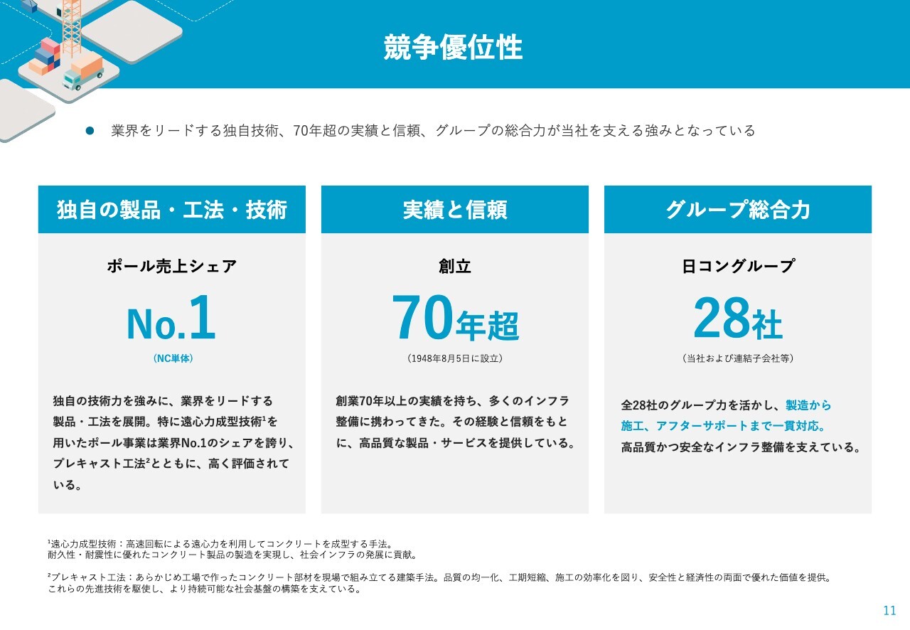競争優位性です。当社は独自の製品・工法・技術を持ち、ポール売上シェアでNo.1を誇っています。また創立70年以上の実績と信頼、さらに全国に約28社を有する日コングループとしての総合力を有しています。これにより、製造から施工、アフターサポートまで一貫対応が可能となっています。