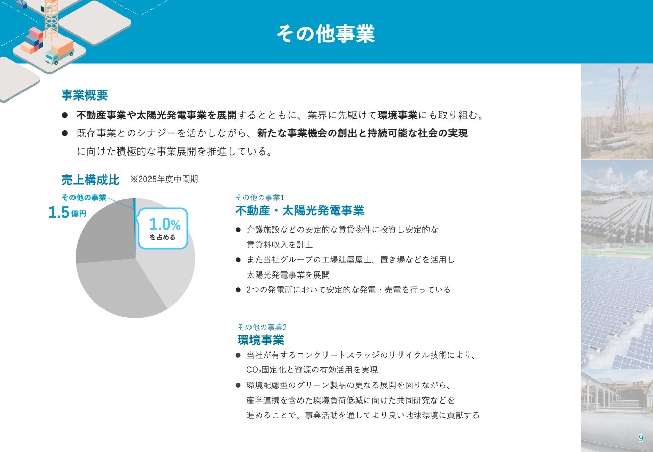 コンクリート二次製品事業では、携帯電話基地局向けのポール出荷が徐々に再開し、適正価格の浸透も一部進んでいます。さらに、建築材料を生産・販売するグループ会社の好調や、PC-壁体など土木製品の販売・施工が順調に推移したことが寄与し、増収増益の結果となりました。