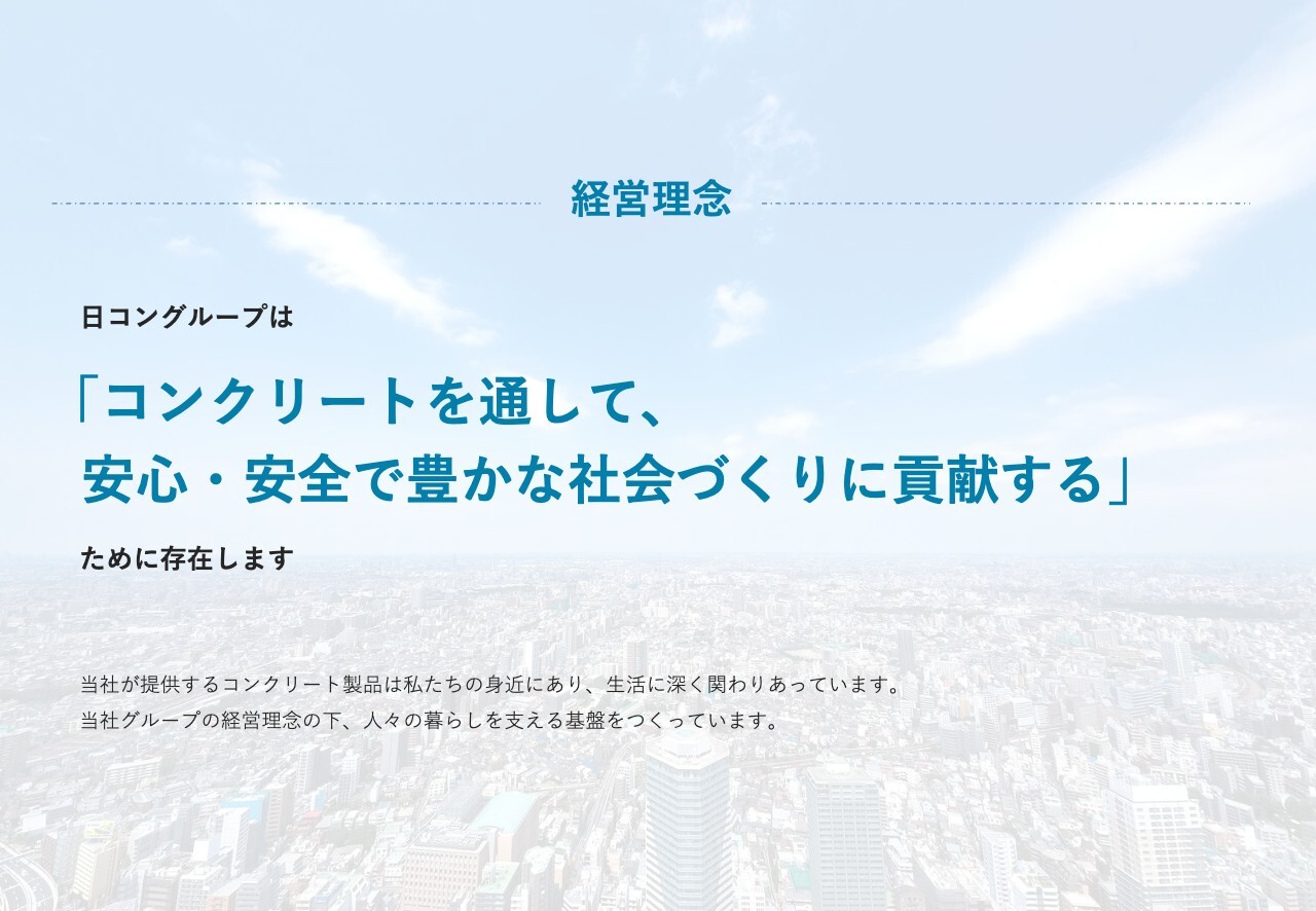 当社は「日コングループは『コンクリートを通して、安心・安全で豊かな社会づくりに貢献する』ために存在します」という経営理念のもと、人々の暮らしを支える基盤を構築する会社です。