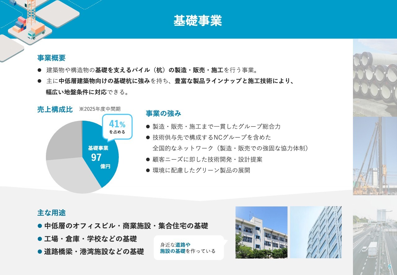 まず基礎事業についてご説明します。事業の概要としては、建築物や構造物の基礎を支えるパイル(杭)の製造・販売、そして施工を行う事業です。主に中低層の建築物向けの基礎杭に強みを持ち、豊富な製品ラインナップと施工技術により、幅広い地盤条件に対応しています。