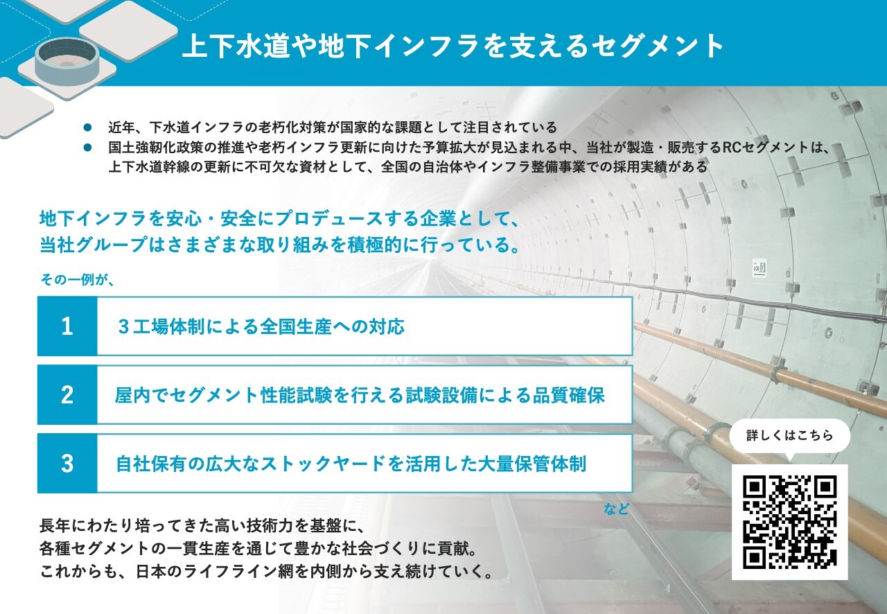 上下水道や地下インフラを支えるセグメントについてお話しします。近年、下水道インフラの老朽化対策が国家的な問題として注目されています。国土強靱化政策の推進や老朽インフラの更新に向けた予算拡大が見込まれる中、当社が製造・販売するRCセグメントは、上下水道幹線の更新に不可欠な資材として、全国の自治体やインフラ整備事業で採用実績があります。