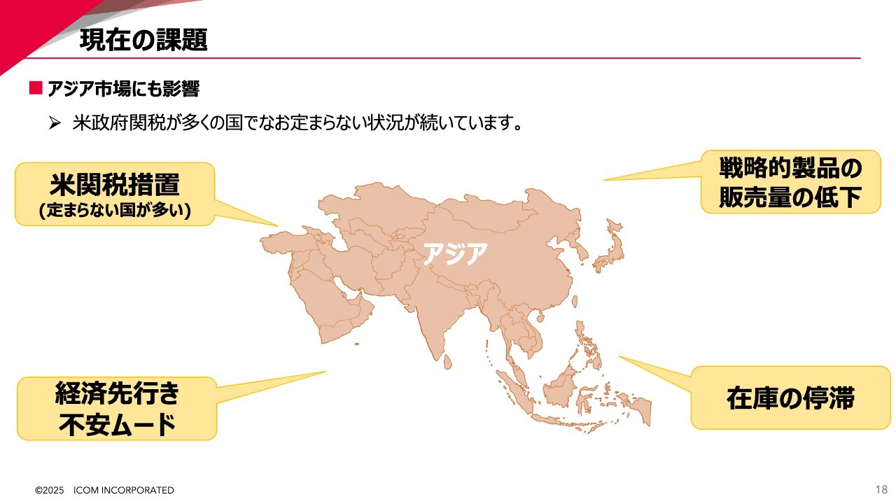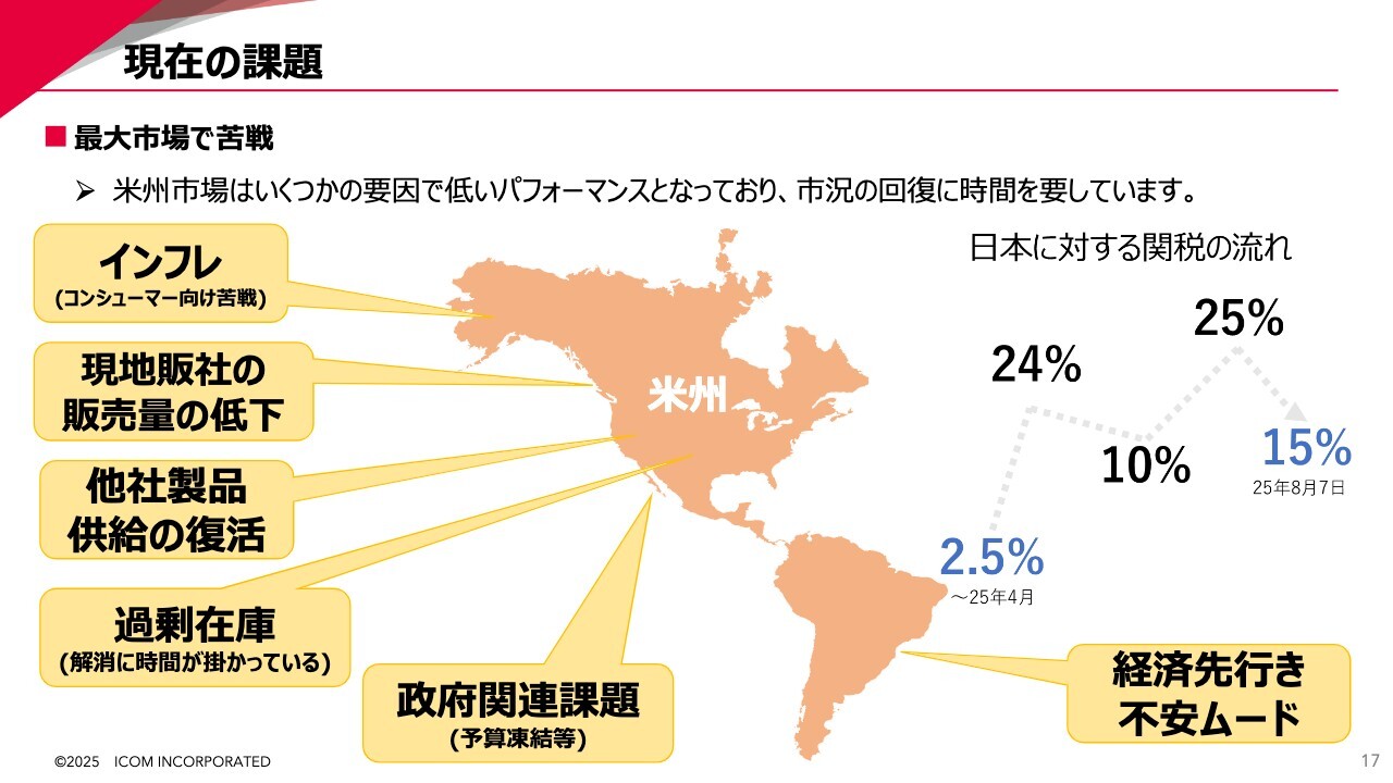 当社の最大市場である米州における課題はスライドのとおりです。まず、以前の決算説明会で説明したように、近年アメリカをはじめ各国でインフレが進行し、例えば個人用船舶や個人用飛行機の購買需要が縮小しており、それに付帯する海上用無線通信機器や航空用無線通信機器の需要に影響を及ぼしています。当社におけるコンシューマーユーザー向け売上の伸長の妨げとなっています。