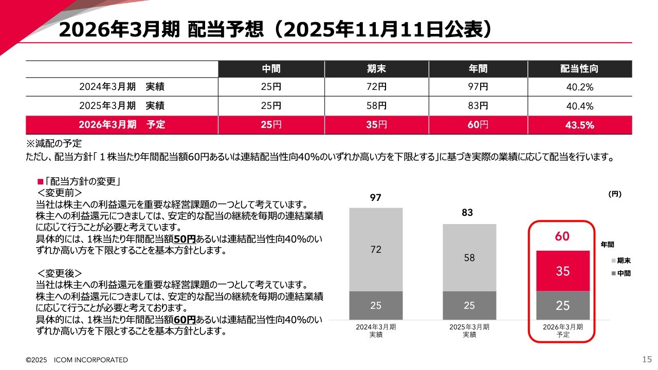 業績予想の修正に伴い、配当予想についても期末配当を当初予想の1株当たり71円から35円へ減配する予定です。これにより、中間配当を加えた年間配当は1株当たり60円となります。