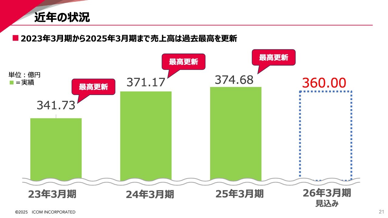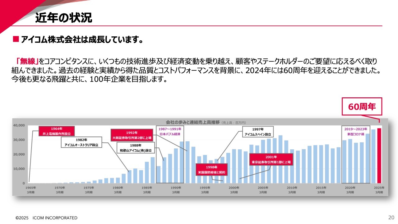 以前の決算説明会では、当社の強みの1つとして、無線機業界での60年以上にわたる事業の変遷を紹介しました。当社は創業時、アマチュア向け無線通信機器の開発・製造・販売を開始し、その後、陸上業務用、海上用、航空用、ネットワーク機器へと業容を拡大しました。近年では、IP無線や衛星無線においても自社で取り組み、イノベーションを推進することで安定した経営を実現し、成長してきました。