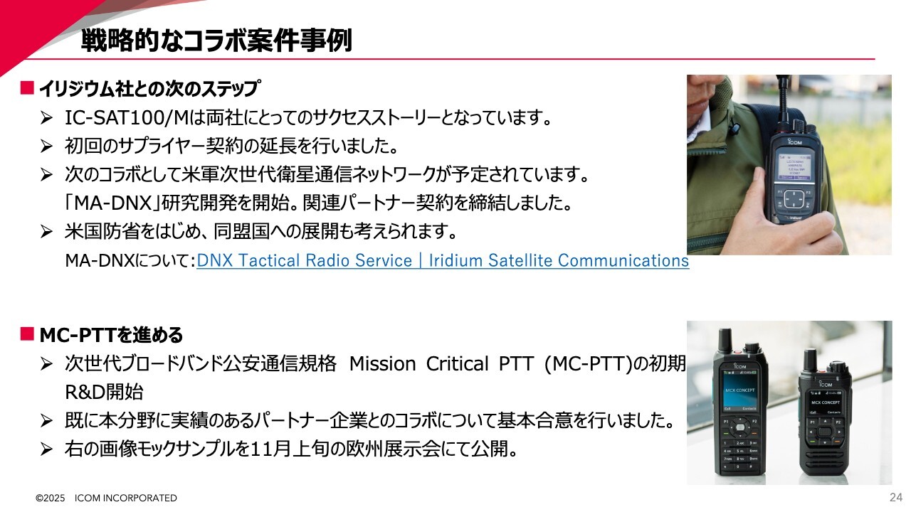 また、2024年11月に発表した「資本コストや株価を意識した経営」にあるとおり、欧州市場をはじめとする次世代公安向けLTE通信システム「MC-PTT(Mission Critical PTT)」の初期段階の研究開発も開始しています。