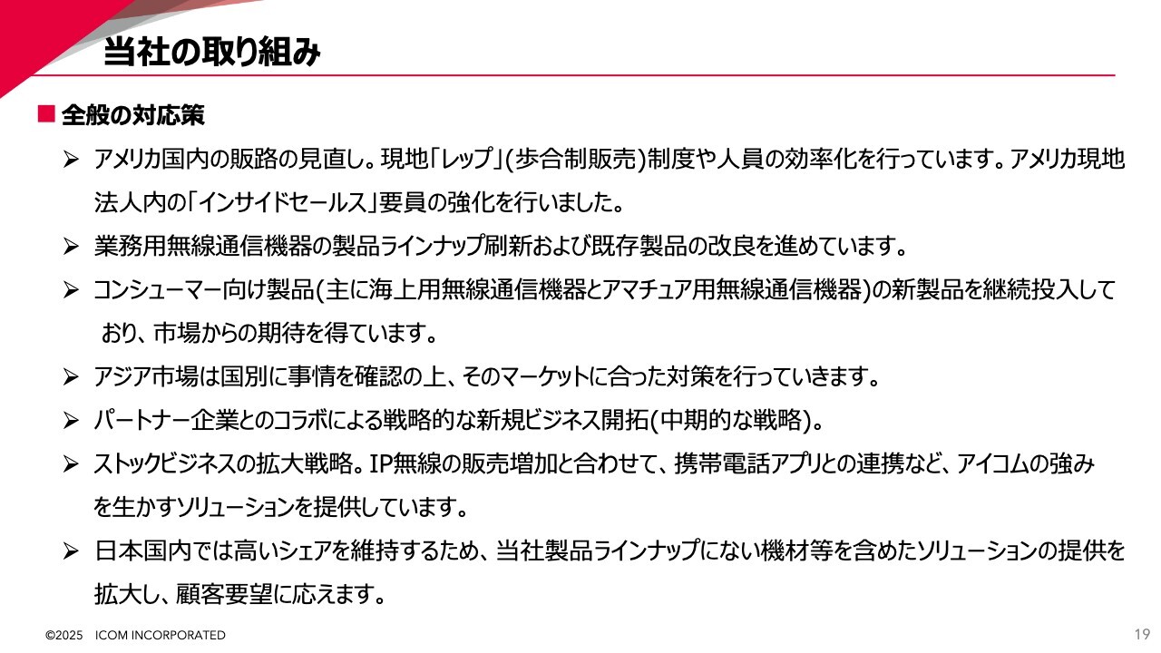 北米では、ディーラーとは別の「レップ」という歩合制で販売を行う独立した営業代理人が多く採用されています。このレップ体制を含め、Icom America社内での販売部隊の見直しを行っています。これには少し時間がかかると見ていますが、今後の販売回復と成長に必要な対策だと考えています。