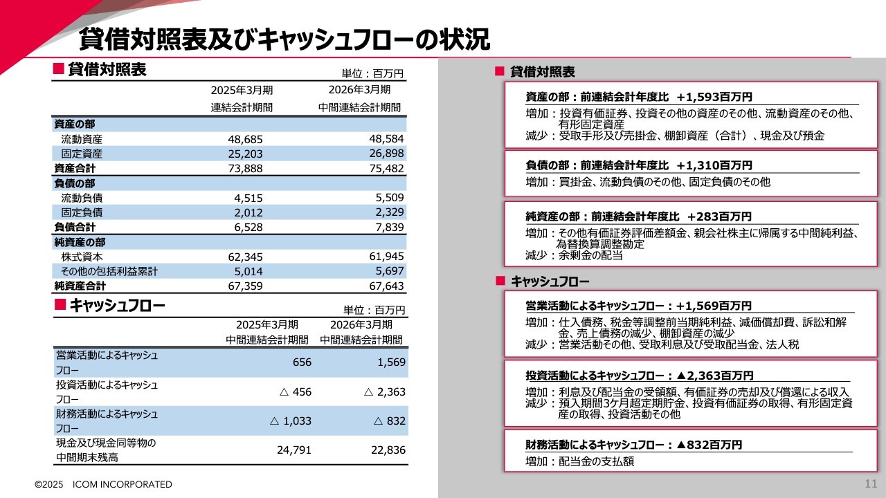 財務活動によるキャッシュフローは8億3,200万円の減少となりました。前年同期は10億3,300万円の減少でした。詳細については、11月11日公表の2026年3月期第2四半期決算短信を参照ください。