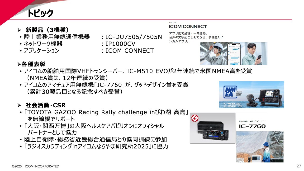 また、海上用無線業界のベンチマークとなっている当社の無線機は、北米のマリン業界を代表するNMEA賞で12年連続受賞を果たしました。祖業であるアマチュア無線通信機器では、昨年発売した「IC-7760」がグッドデザイン賞を受賞し、これはアイコムとして30機種目となる記念すべき受賞です。