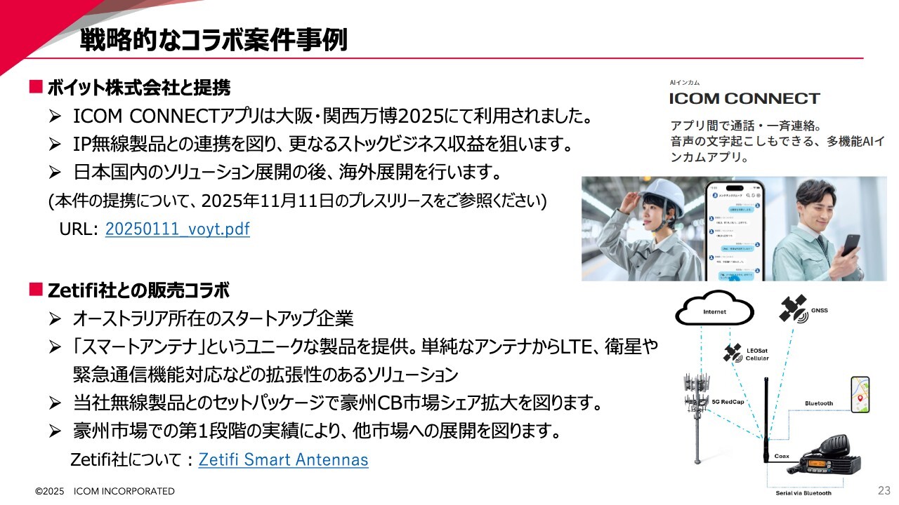 2025年11月11日に、ボイット社との戦略的提携に関するプレスリリースを発表しました。当社はこれまで独自にスマートフォンアプリをリリースしてきましたが、ボイット社のインカムアプリケーションが持つ優れた機能や、今後のアプリケーションと当社IP無線との融合および拡張性を考慮し、「ICOM CONNECT」アプリケーションのリリースに至りました。