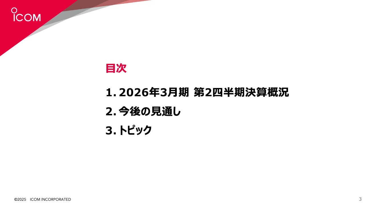 中岡洋詞氏:本日はお忙しい中、アイコム株式会社の決算説明会にご出席いただき、誠にありがとうございます。代表取締役社長の中岡洋詞です。どうぞよろしくお願いします。