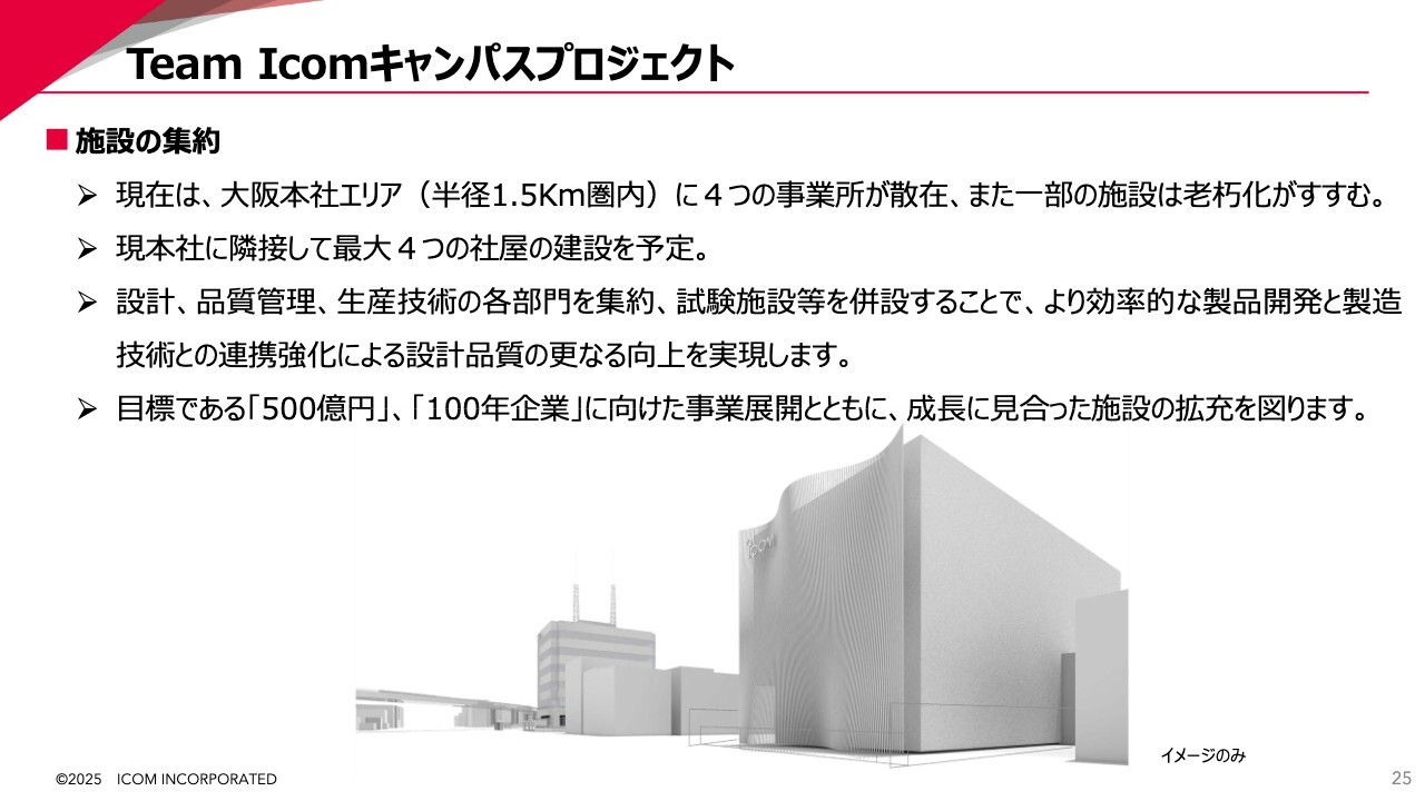 こちらのスライドはご参考までにご覧ください。100年企業を目指し、中期経営計画の投資計画にも掲げていますが、今後の当社の成長を見据え、「Team Icomキャンパスプロジェクト」を発足しました。