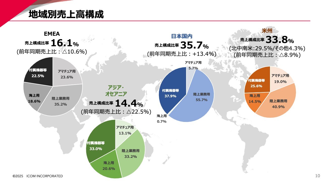 一方で、航空用無線通信機器は好調な売上により構成比を1ポイント伸ばし、付属品その他は消防や教育機関向け案件の獲得によって構成比を5ポイント伸ばしました。