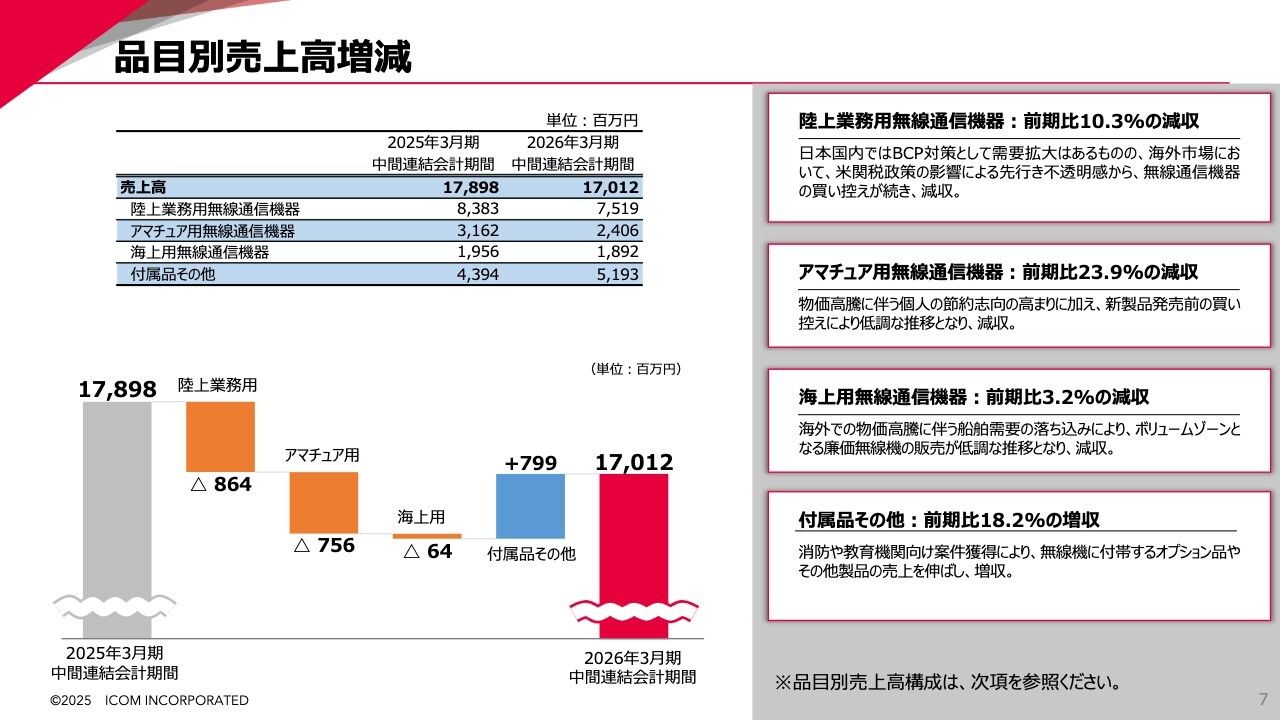 品目別の売上状況はスライドのとおりです。陸上業務用無線通信機器は、BCP対策に伴う需要拡大や、前期に引き続きストックビジネスの伸長が見られました。しかし、海外では、米国政府の関税政策の影響による先行き不透明感から買い控えが続き、8億6,400万円の減収となりました。