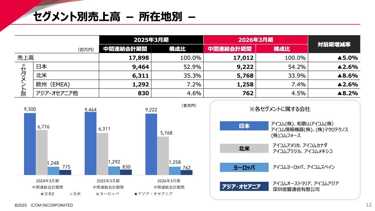 本スライドに記載の2026年3月期中間連結会計期間の増減比率は、前項で説明した売上の地域別およびカテゴリ別の実績です。各地域の主な増減要因については、前のスライドで説明したとおりです。