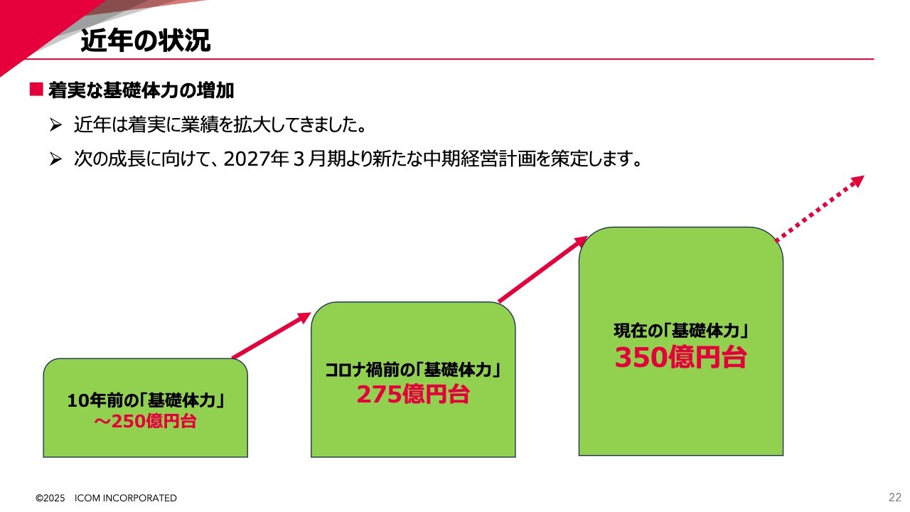 近年の成長要因としては、ストックビジネスの収益が大きく貢献しています。現在のストックビジネス収益比率は、「中期経営計画2026」の最終目標である10パーセントを超えています。その結果、「基礎体力」という観点から見ると、会社の業績はこの10年間で250億円台から275億円台だった水準を、350億円台にまで引き上げることができたと言えます。