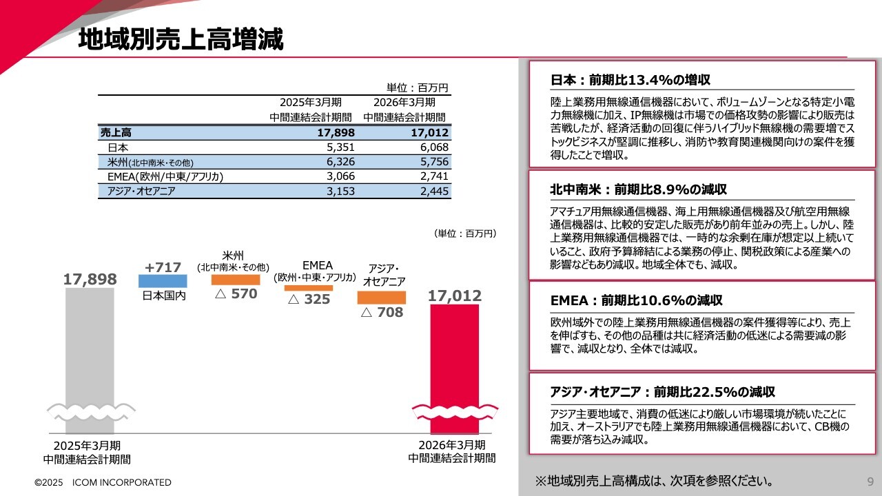海外市場では、米州において、陸上業務用無線通信機器の一時的な余剰在庫が想定以上に続いていることや、政府予算凍結による業務停止、関税政策による産業への影響などから売上が低調となり、5億7,000万円の減収となりました。