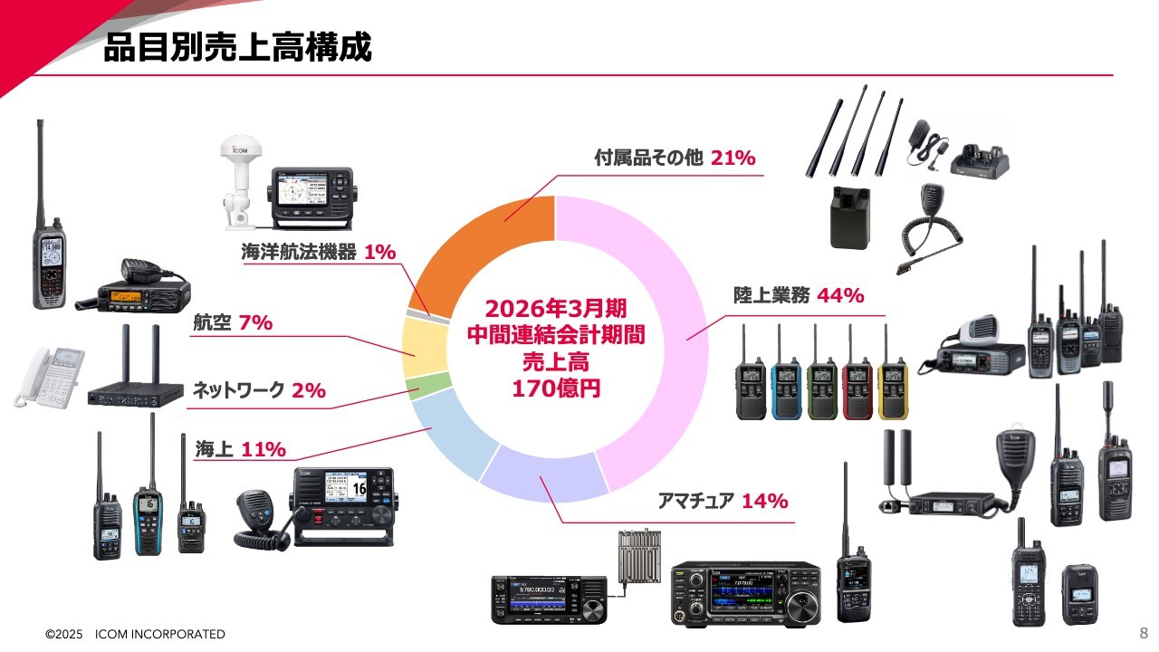 製品ポートフォリオおよび2026年3月期の中間連結会計期間における各カテゴリの販売比率です。先ほどの説明のとおり、海外の需要減少の影響を受けて陸上業務用無線通信機器およびアマチュア用無線通信機器はそれぞれ構成比が3ポイント下落しました。