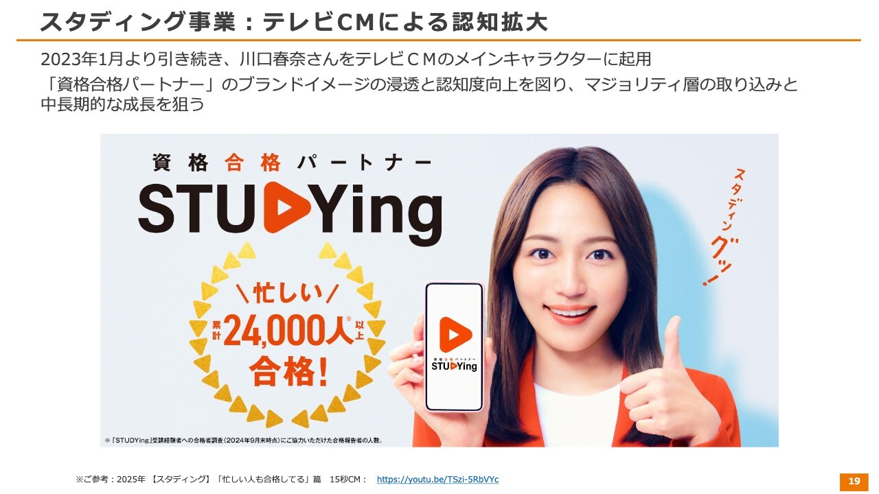 2点目はブランド認知の強化です。先ほど申し上げたテレビCMではブランド広告を展開しており、当社の認知度は着実に高まっています。ただし、従来から何十年も前から通学講座を提供している企業は、非常に高い認知度を持つケースが多いのも実情です。