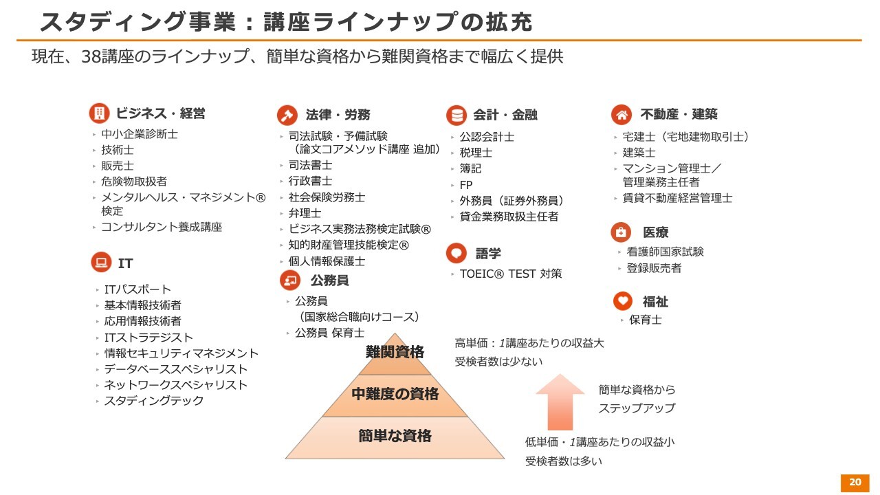 そのため、裾野として簡単な資格の受講者を増やしつつ、最終的には難関資格に合格していただくことを目指し、講座ラインナップのポートフォリオを構築して経営しています。