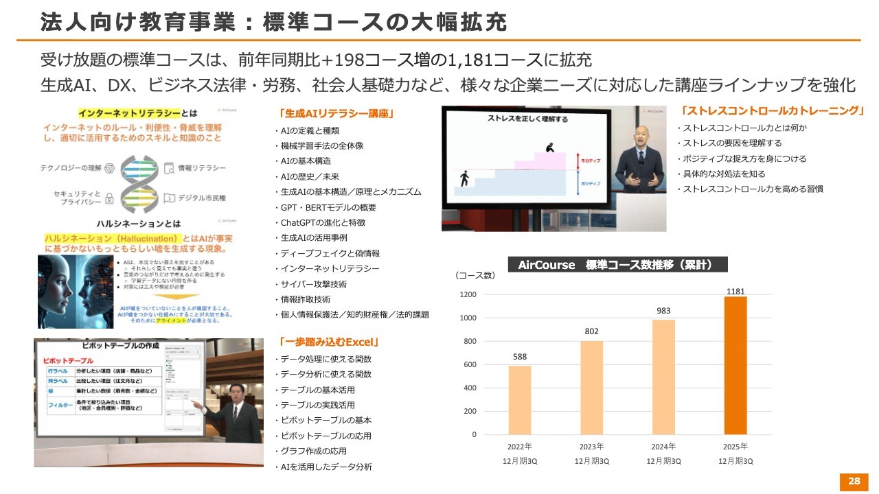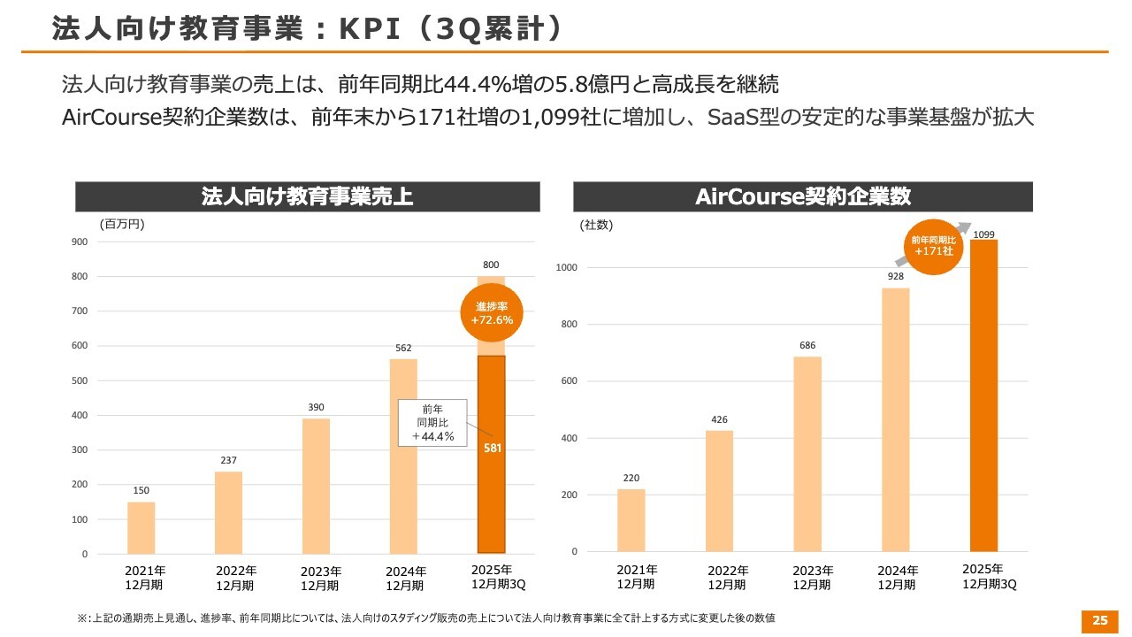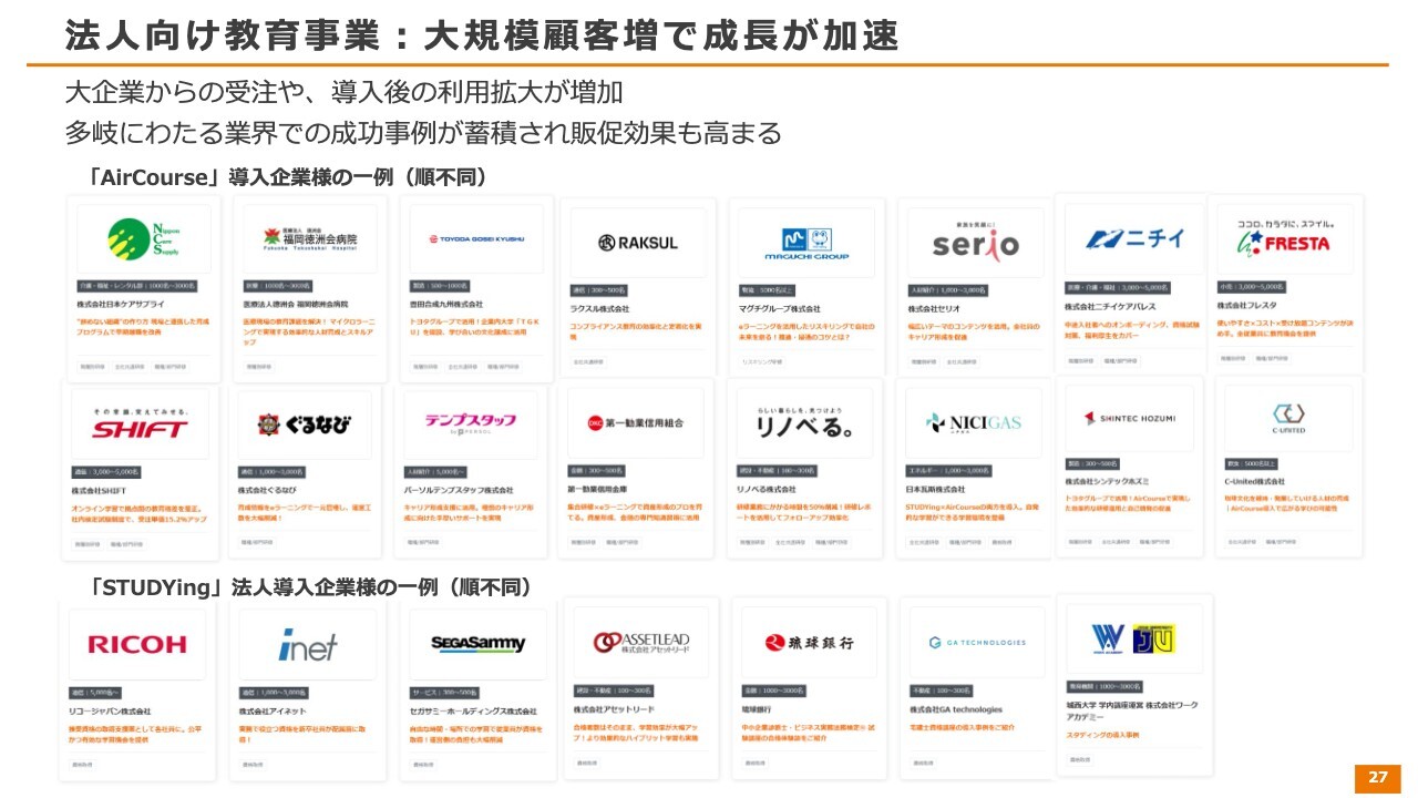 法人向け事業についてです。法人向けの事業では、企業向けeラーニングサービスである「AirCourse」が中心となっています。この「AirCourse」は、現在成長が著しく、前年同期比44.4パーセント増となっており、高成長を継続しています。