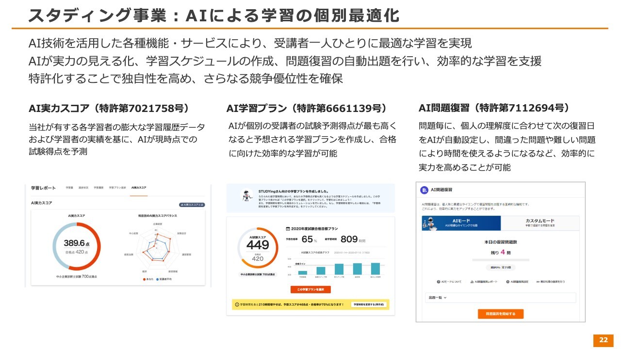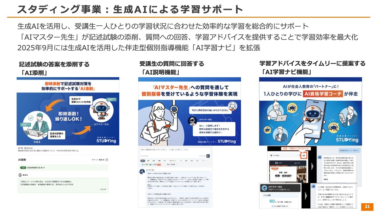 当社の特徴として、AIの活用が他社との差別化において大きなポイントとなっていることです。現在、生成AIを活用した学習サポートを強化しており、例えば、論文試験や記述試験の添削を行う「AI添削」や、受講生の質問に即座に回答する「AI説明機能」などがありますが、この第3四半期では「AI学習ナビ機能」の強化を進めました。