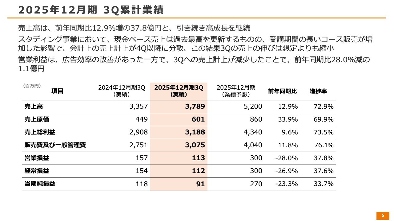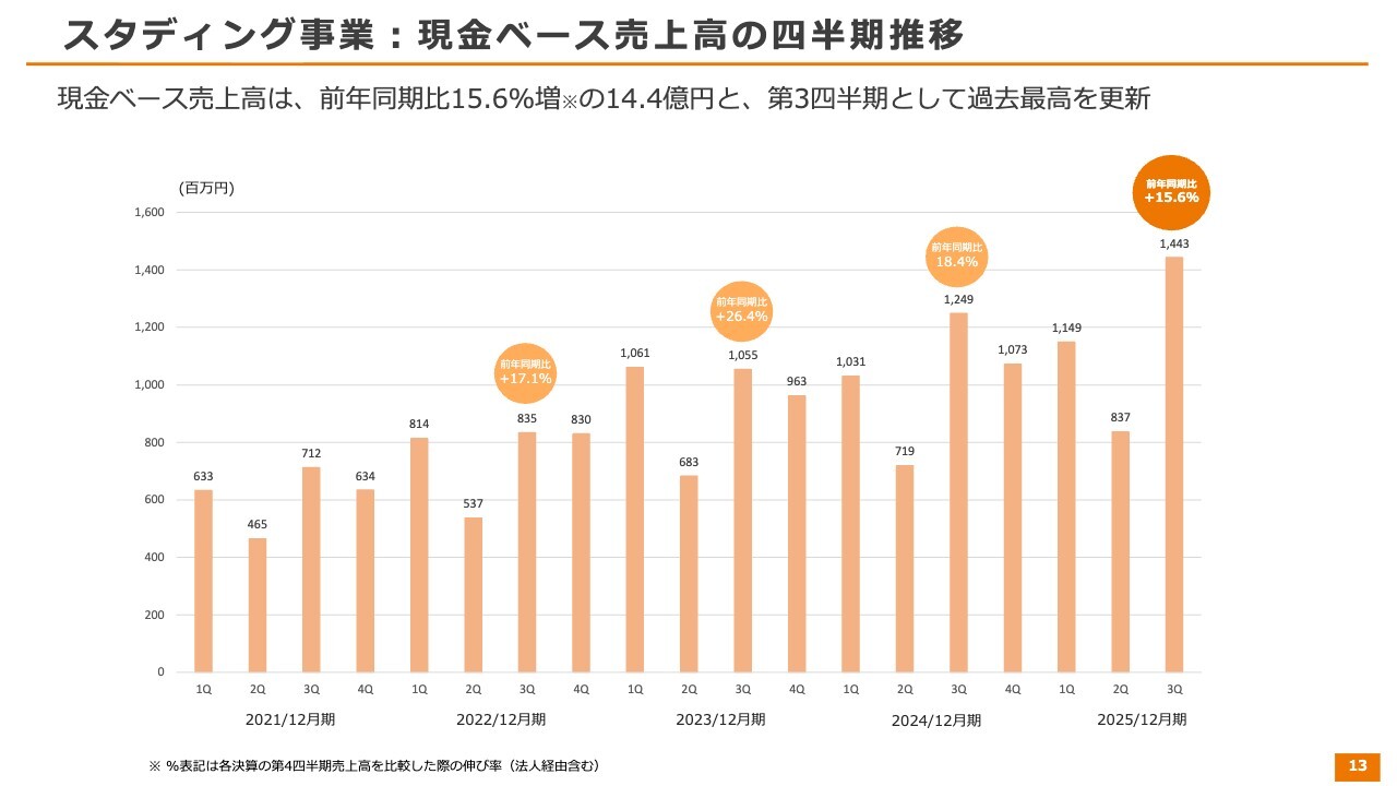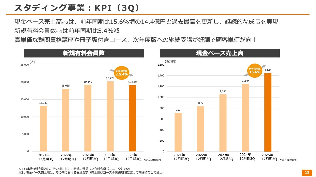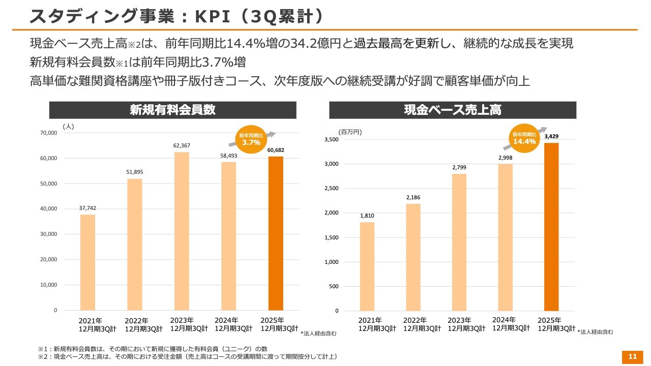 ハイライトの2点目に記載しているとおり、スタディング事業は当社の主力事業です。こちらはオンライン講座をWebで販売する事業で、この販売金額が当社における現金ベース売上です。こちらに関しては、第3四半期が非常に好調で、過去最高を更新しました。