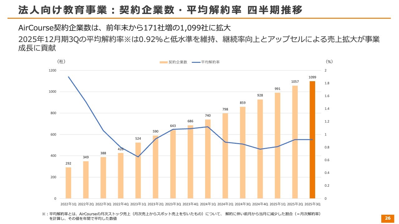 法人向け教育事業:契約企業数・平均解約率 四半期推移