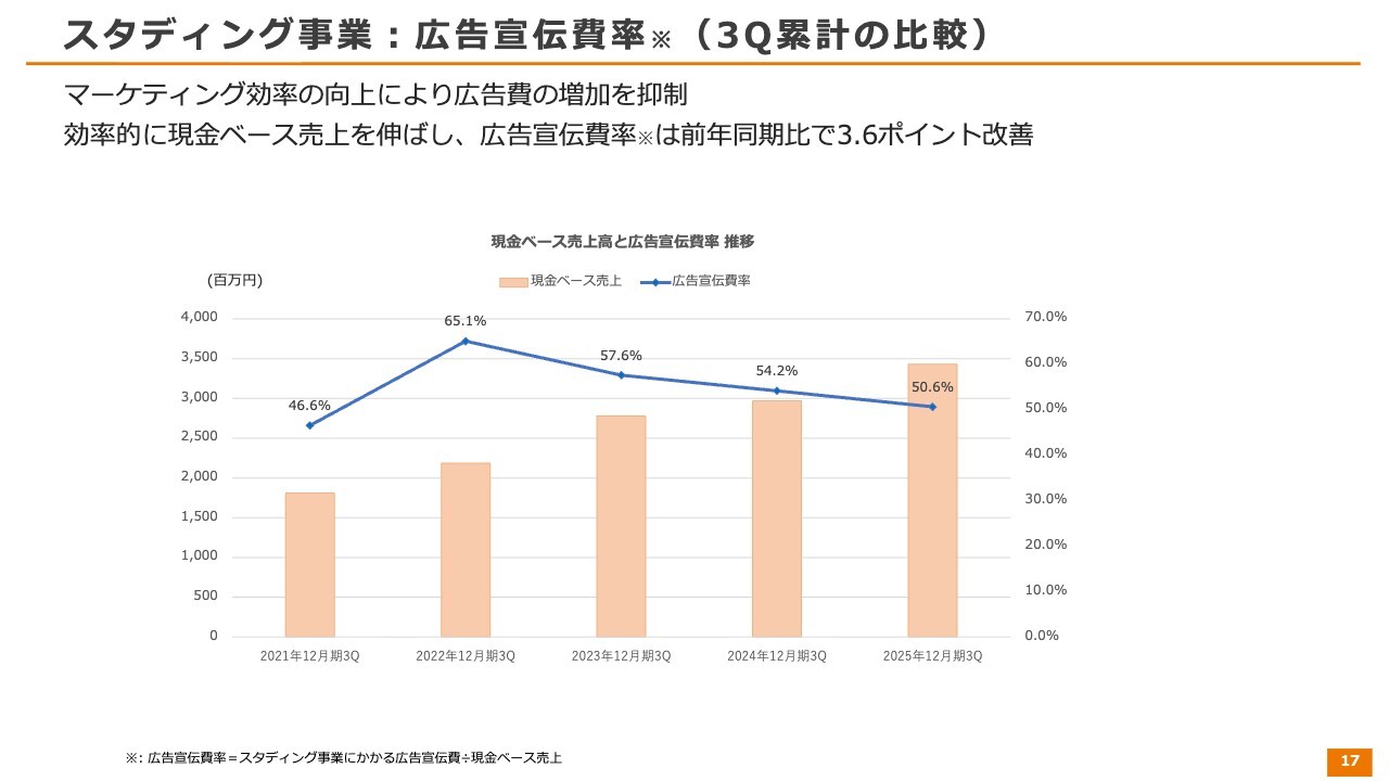 スタディング事業における広告宣伝費比率についてですが、こちらは現金ベースに占める広告宣伝費の割合を指します。