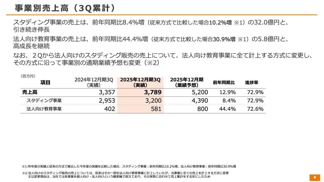 また、法人向け教育事業の売上は前年同期比44.4パーセント増です。従来方式で比較した場合は前年同期比30.9パーセント増となり、ここ最近の傾向とほぼ変わらず、高成長を続けています。