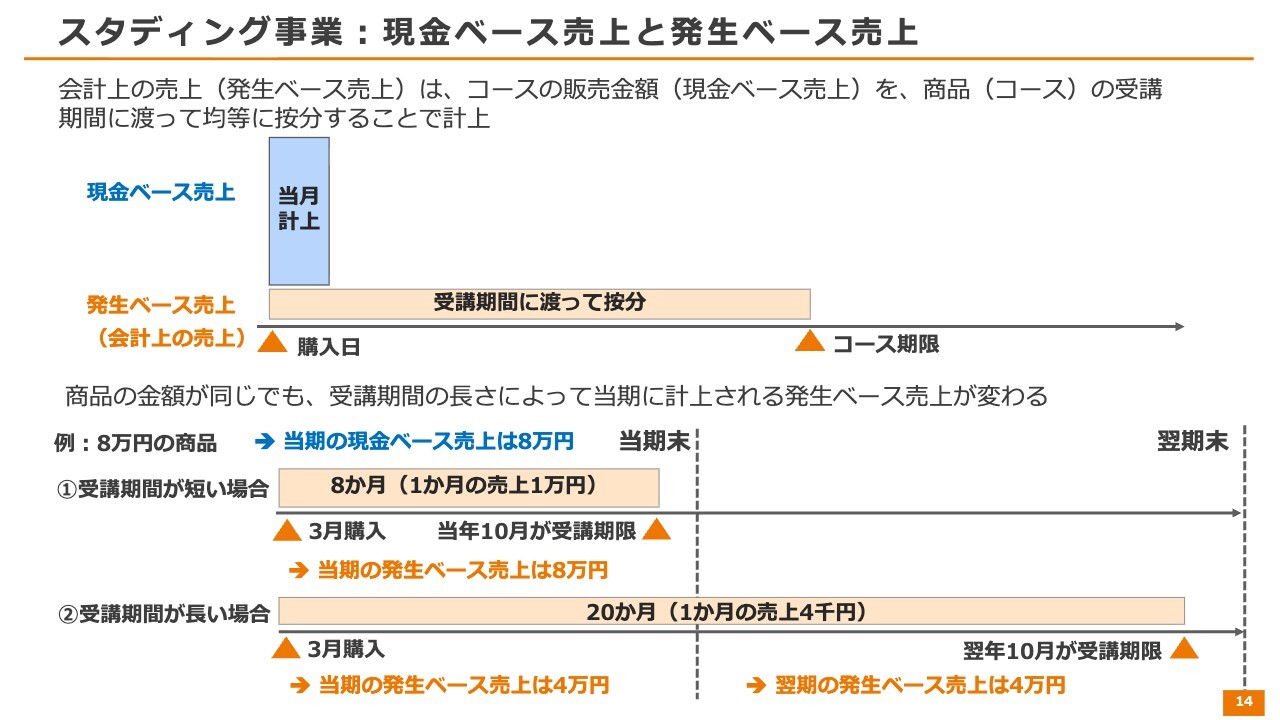 この発生ベースの売上は、コース期間が長ければ長いほど、売上の計上時期が後ろにずれる構造になっています。この点を示しているのが、スライド下部の図になります。