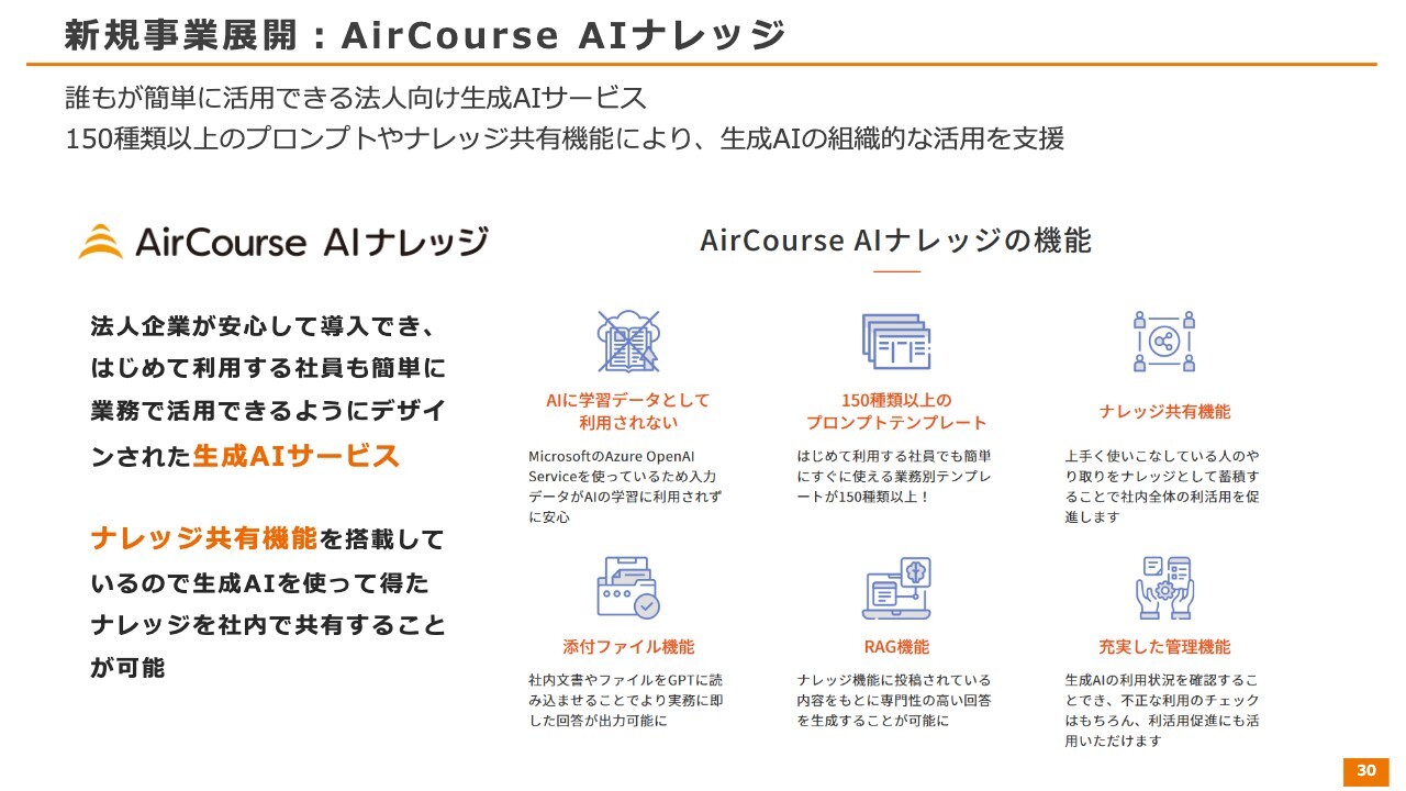 もう1つの新規事業展開として、「AirCourse AIナレッジ」という生成AIを活用したサービスがあります。これは「AirCourse」と連動して利用できるかたちになっており、「AirCourse」にはナレッジ共有機能が含まれています。企業がコースを作成したり、ナレッジを登録できる機能です。