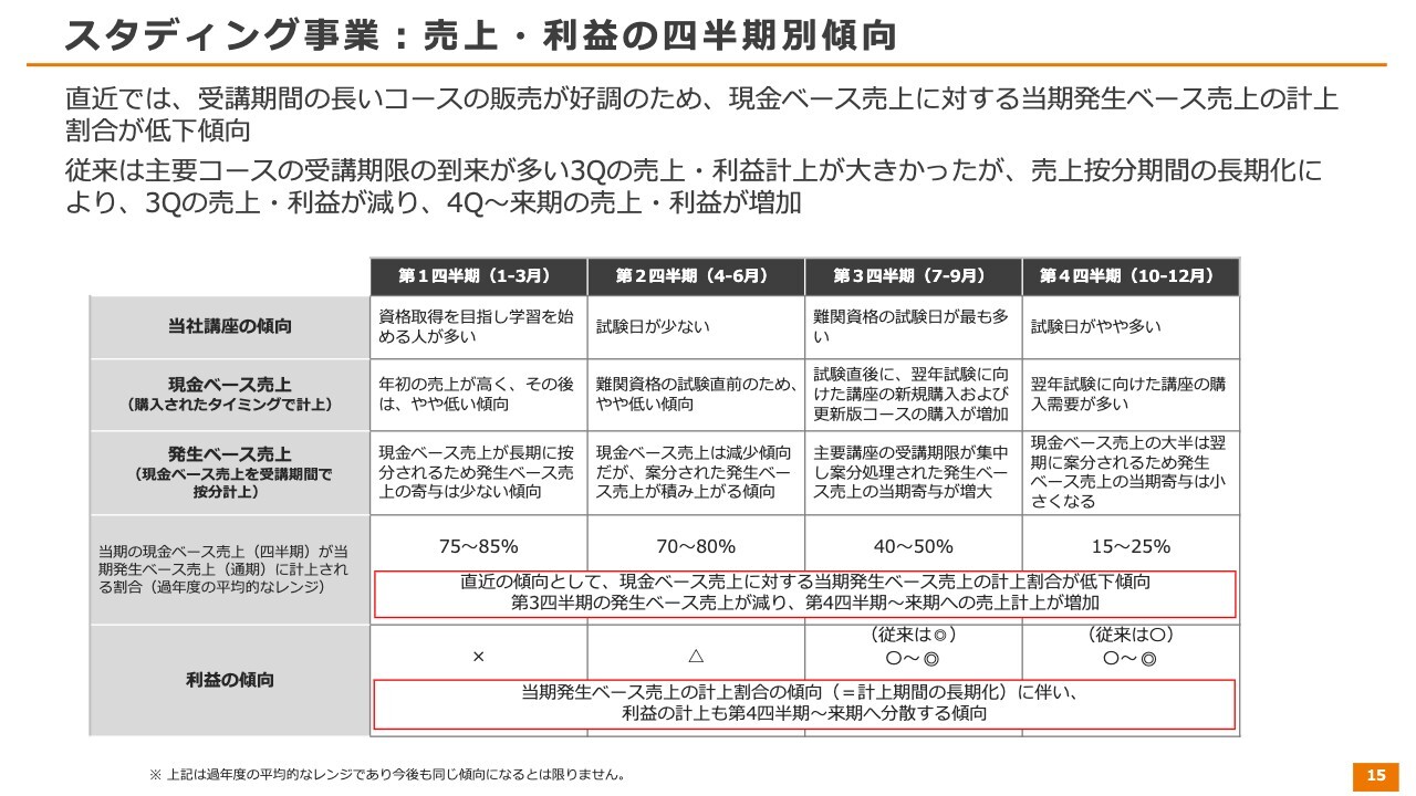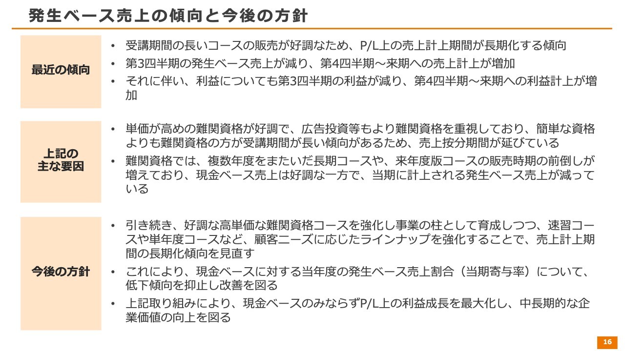 最近の傾向として、受講期間の長いコースの販売が好調であるため、P/L上の売上計上期間が長期化しており、第3四半期の発生ベース売上が減少し、第4四半期から来期への売上計上が増加しました。さらにそれに伴い、第3四半期の利益も減少し、第4四半期から来期への利益計上が増加しました。第3四半期の売上と利益が想定よりも少なかったのはこのためです。