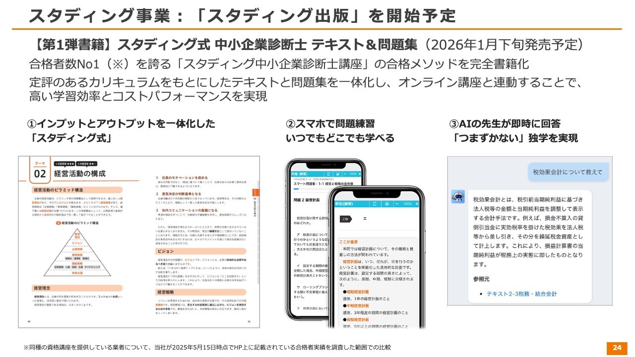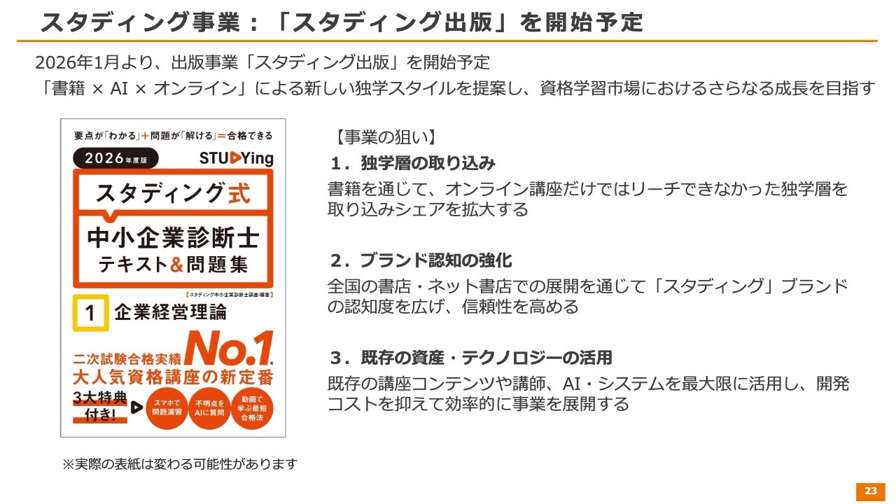 また、1つトピックスとして、2026年1月からスタディング出版という新規事業を開始します。これは紙の書籍を販売する事業で、独学者の取り込みを狙ったものです。こちらについても、本編でご紹介します。