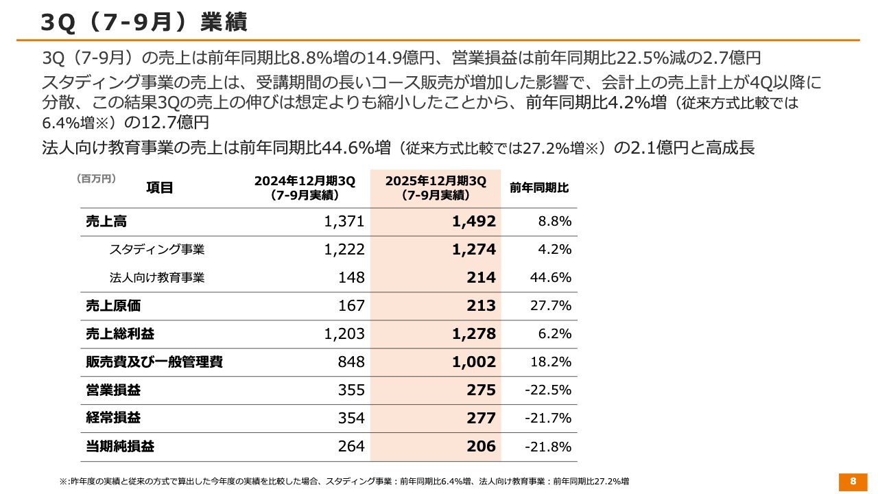 スタディング事業では売上高が前年同期比8.4パーセント増となりました。ただし、先ほどお伝えしたとおり、この8.4パーセント増は会計上の影響によるものです。