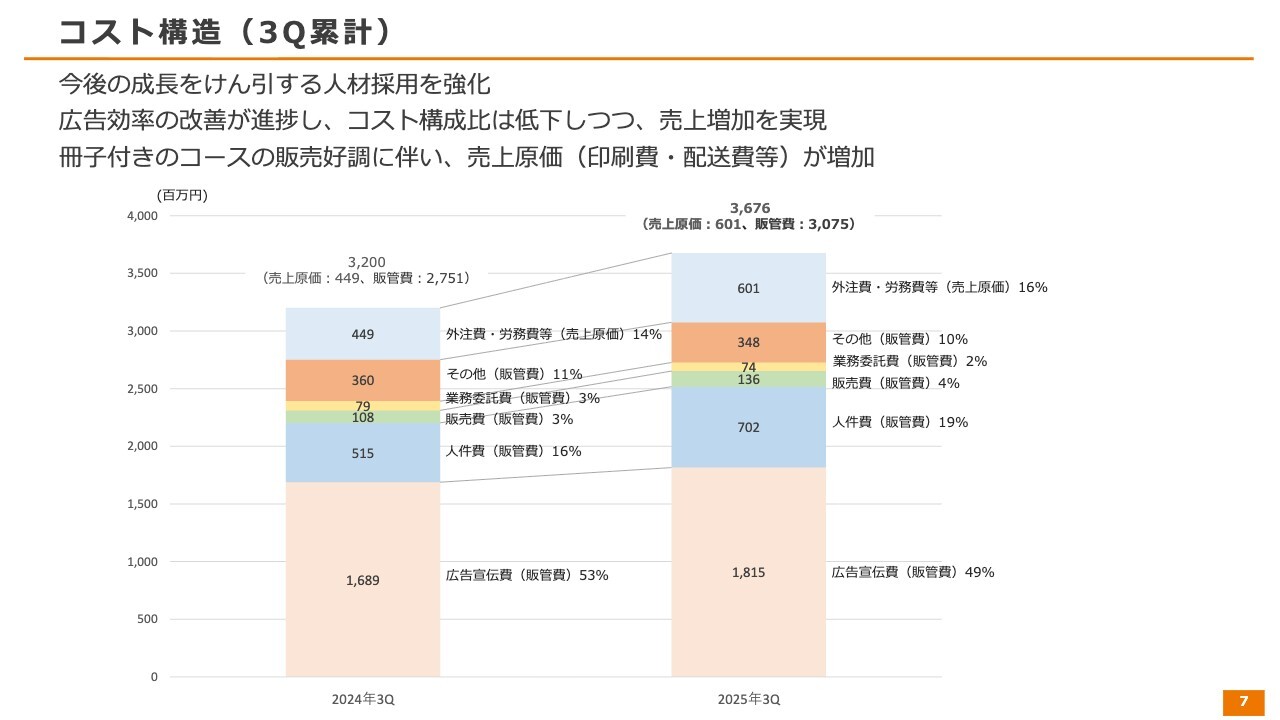 売上原価については、約2ポイント増加しています。主な要因としては、冊子付き商品の販売が増加していることが挙げられます。冒頭でもお話ししましたが、スタディング事業では、難関資格向けの講座が非常に好調です。