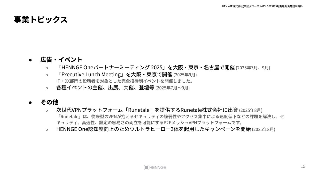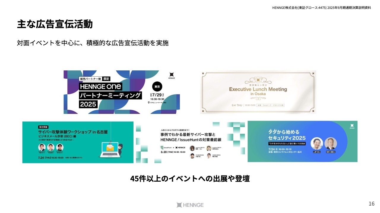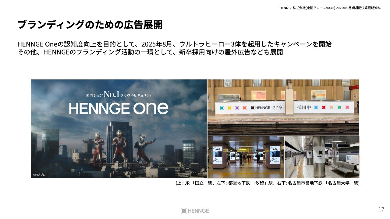 また、当四半期は、認知度やブランド力の向上のための活動にも注力しました。特に、HENNGE Oneの認知度向上を目的として、8月からウルトラヒーロー3体を起用したキャンペーンを開始しています。