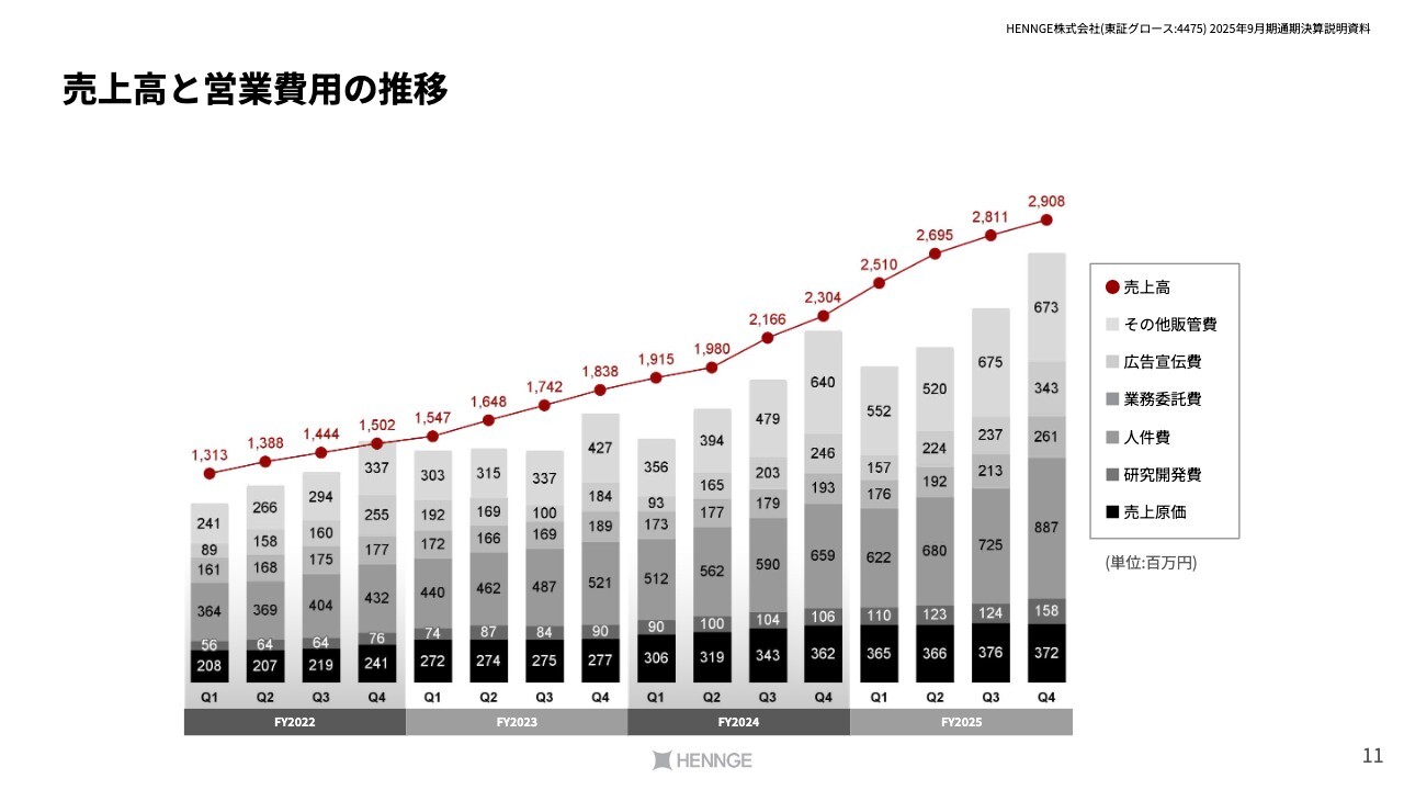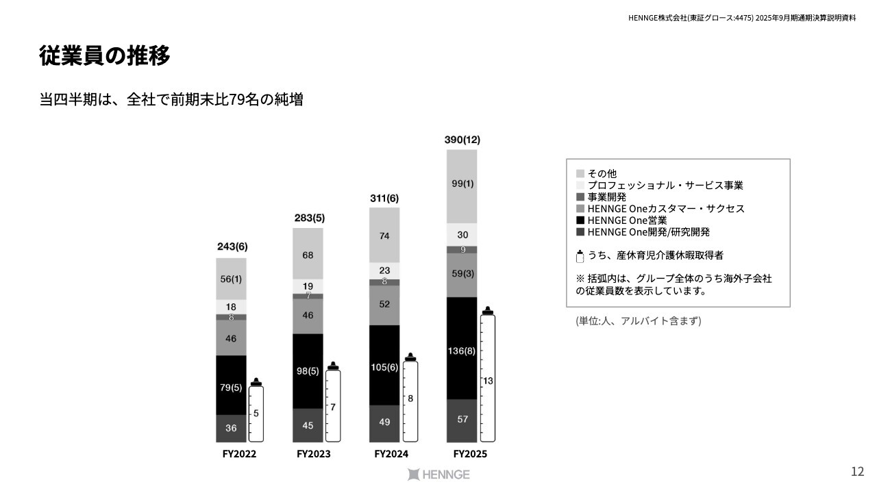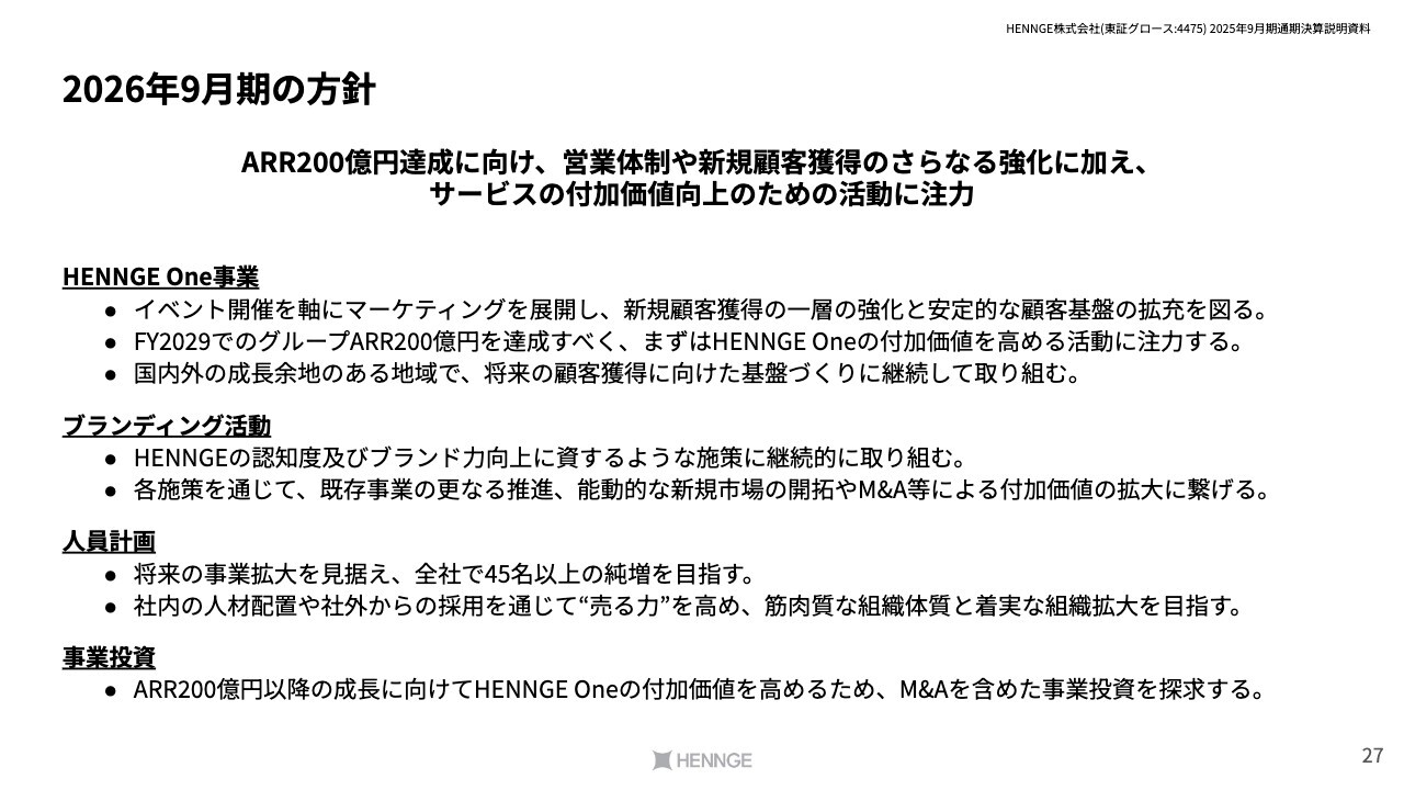 しかし、私たちのサービスを「売る力」を重点的に補強する必要があると考えており、2025年9月期に未達だった営業人員の獲得、またカスタマーサクセスにかかる人員など、カスタマーフェイシングな部門にフォーカスして人員を拡充していきたいと考えています。