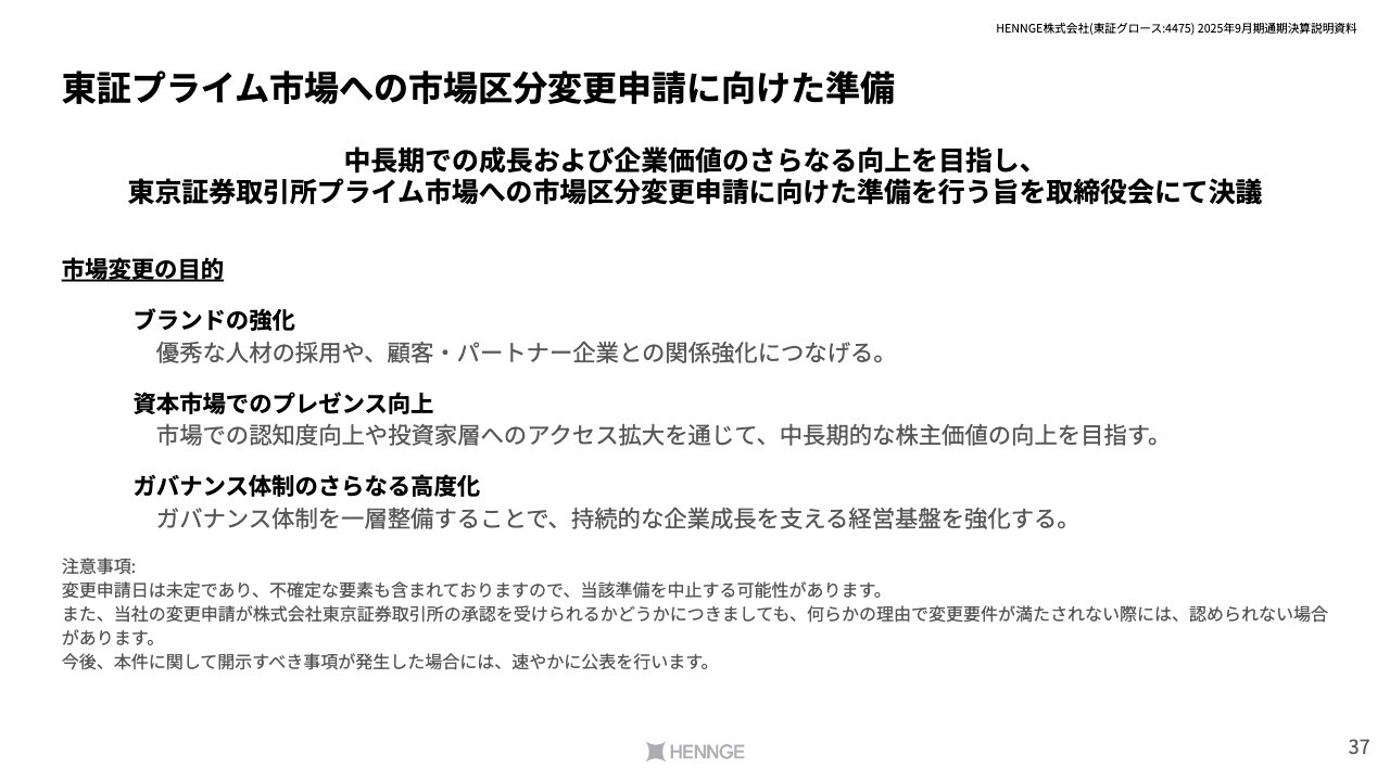 このような課題を解決し、今後の持続的な成長を実現するためにも、東証プライム市場への市場変更を目指したいと考えています。まだ具体的な日程や詳細をお伝えできる段階ではありませんが、続報がありましたら、適切に開示していきます。まずは、この場をお借りして、投資家のみなさまにお知らせするとともに、今後とも一層のご支援とご指導を賜りますよう、よろしくお願い申し上げます。
