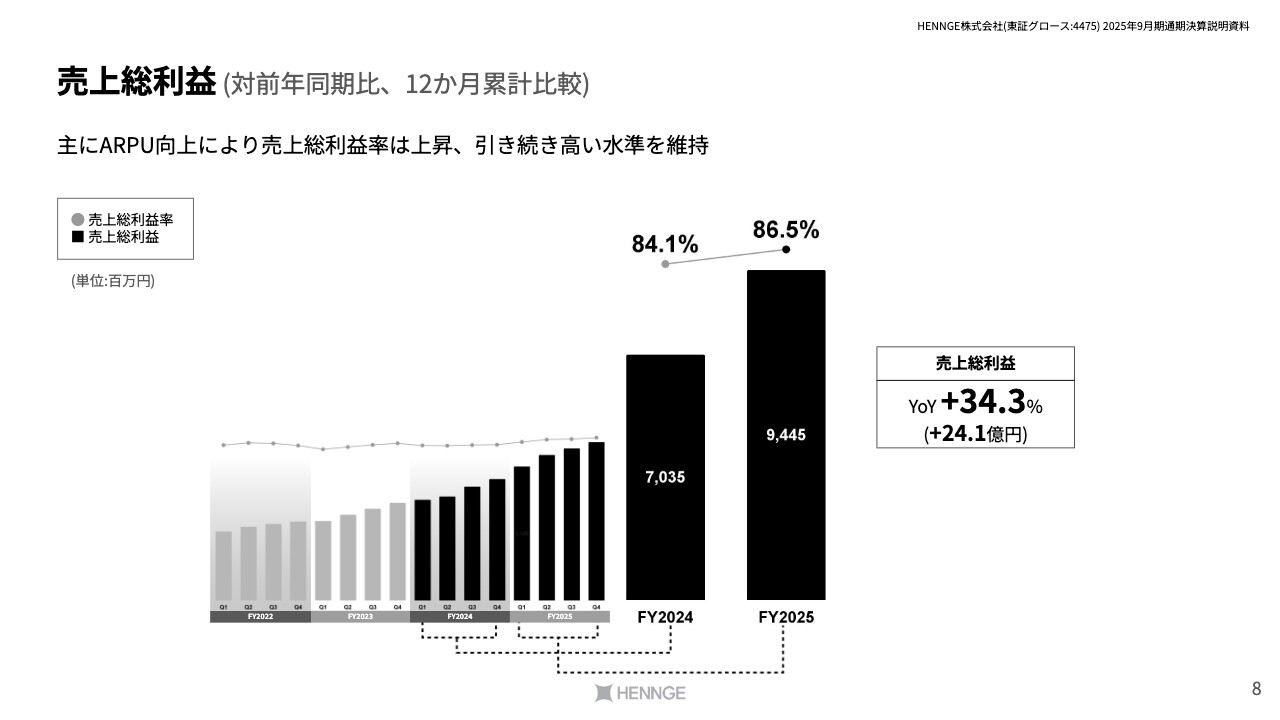 売上総利益および売上総利益率の対前年同期比は、スライドのとおりです。主にARPUの向上により売上総利益率は上昇し、引き続き高い水準を維持しています。