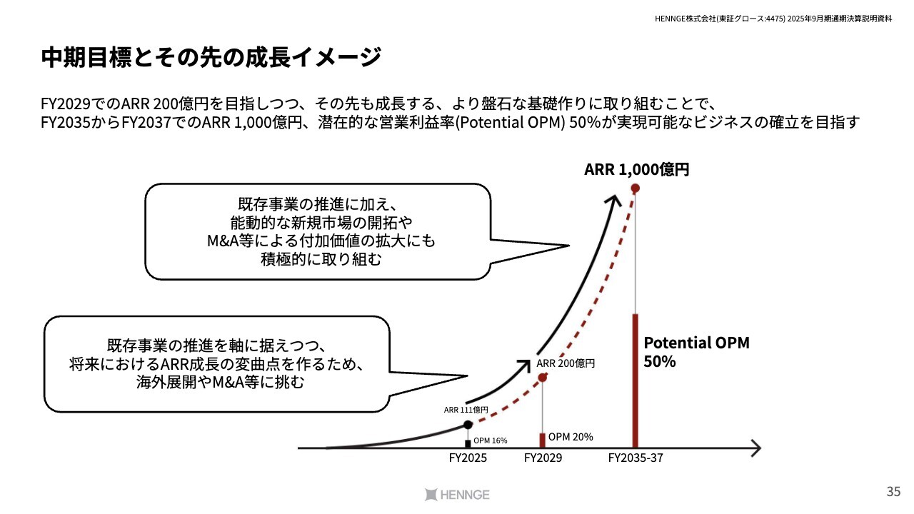 私たちは、2035年9月期から2037年9月期にかけてARR1,000億円、潜在的な営業利益率50パーセントを実現するビジネスモデルの構築を目指しています。その実現に向けては、今後10年以上にわたりARRの年平均成長率20パーセントから30パーセントを維持する必要があり、決して容易な道ではありません。