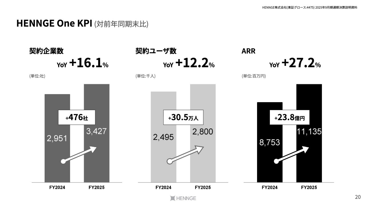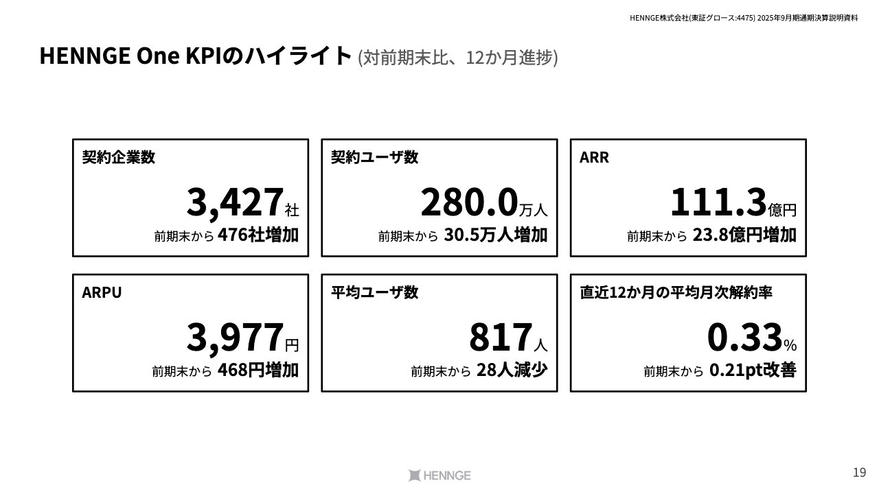 HENNGE Oneにおける3つのKPIの推移は、スライドのとおりです。HENNGE Oneを主力とする当社グループのビジネスは、基本的にサブスクリプション・モデルです。当期中に獲得した契約は解約されない限り積み上がっていき、翌期以降の売上の基盤となります。ご覧のとおり、HENNGE OneのARRは順調かつ安定的に積み上がってきています。
