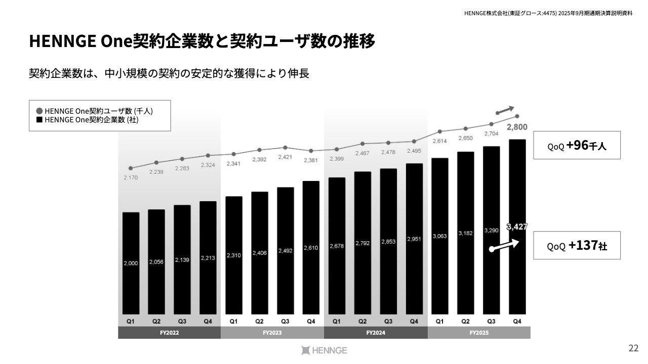 契約企業数と契約ユーザ数の四半期ごとの推移は、スライドのとおりです。当四半期は、比較的大きめの企業からの契約をいくつか獲得できたことに加え、引き続き、販売パートナーとの連携強化により、中小規模の企業からの契約を安定して獲得することができています。