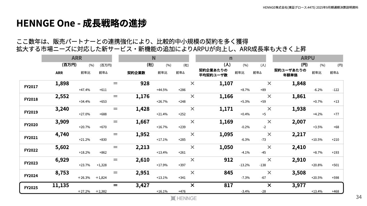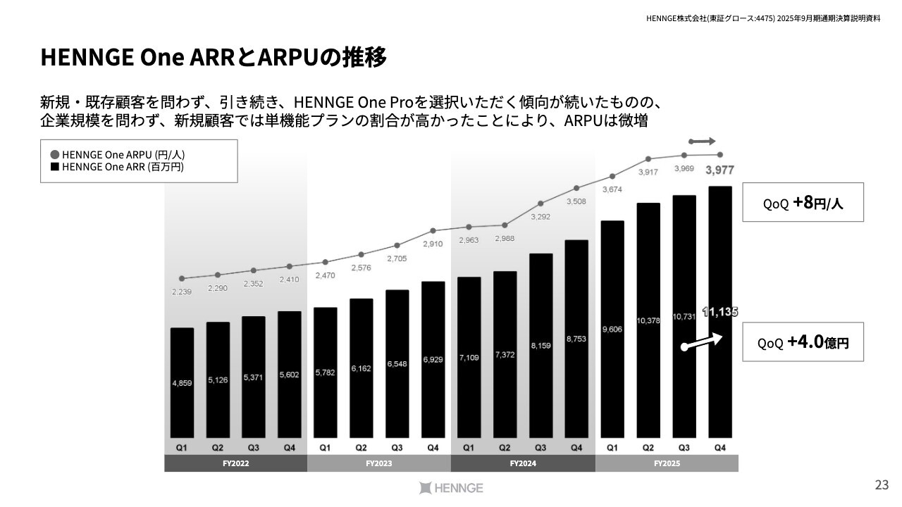 従前より新規顧客の獲得とARPUの向上によってARRを伸ばしていきたいとお伝えしてきましたが、2025年9月期についてはARPUの寄与が比較的大きかったと感じています。これは2024年4月に価格改定を実施したため、その影響を受けた自然な流れと考えています。