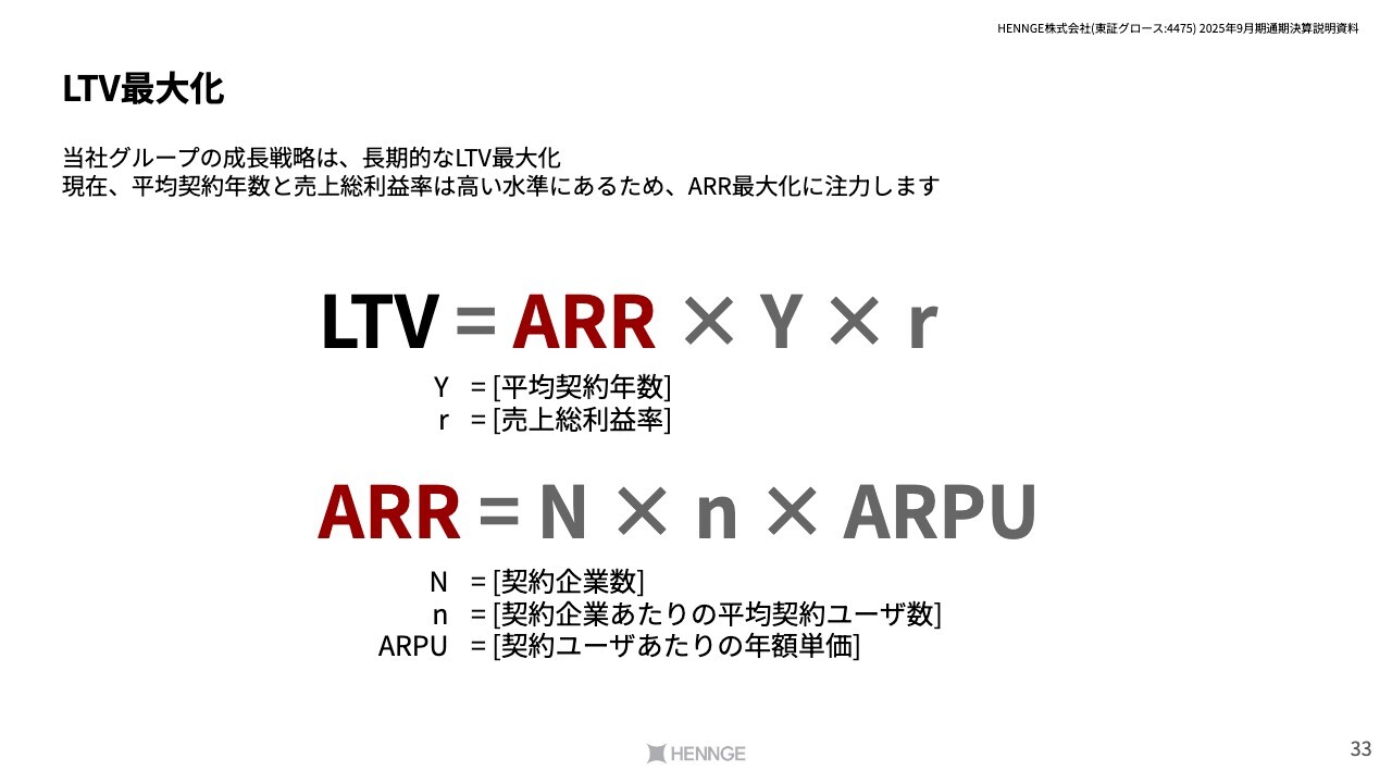 現在、平均契約年数と売上総利益率はすでに高い水準にあります。したがって、LTVの最大化にはARRの最大化が必要であるという状況です。私たちは、投資対効果の高い活動を積極的に行い、ARRを積み増すことに注力します。