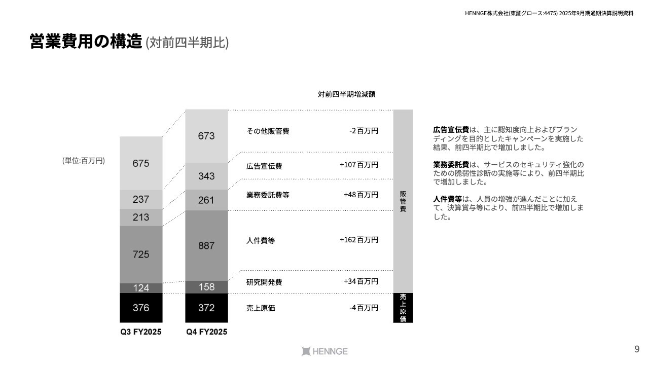 小林:2025年9月期第4四半期の費用が多かったのは、主に広告宣伝費と人件費の増加です。広告宣伝費については、これまでとは少し毛色の異なるブランディングに注力したことが影響しました。